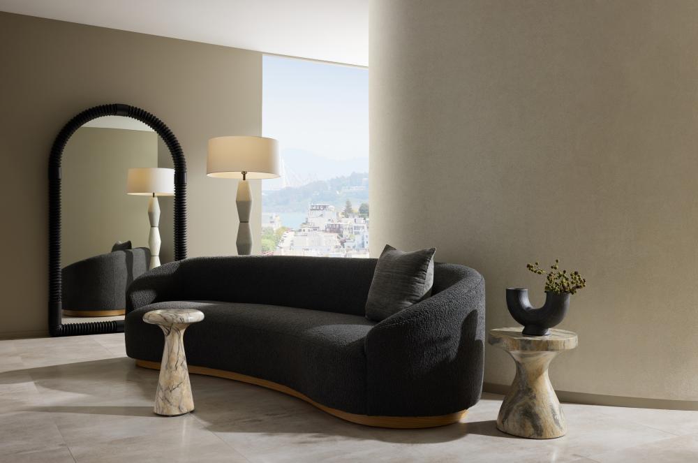 The playful, uninhibited lines of the Italian Memphis furniture movement inform a carved arch mirror. Crafted of mango wood with an ebony finish, its substantial lines are accented with arched breaks. Designed to be hung vertically or placed on the floor, this impactful style it is stabilized with a security cleat. Finish will vary.
