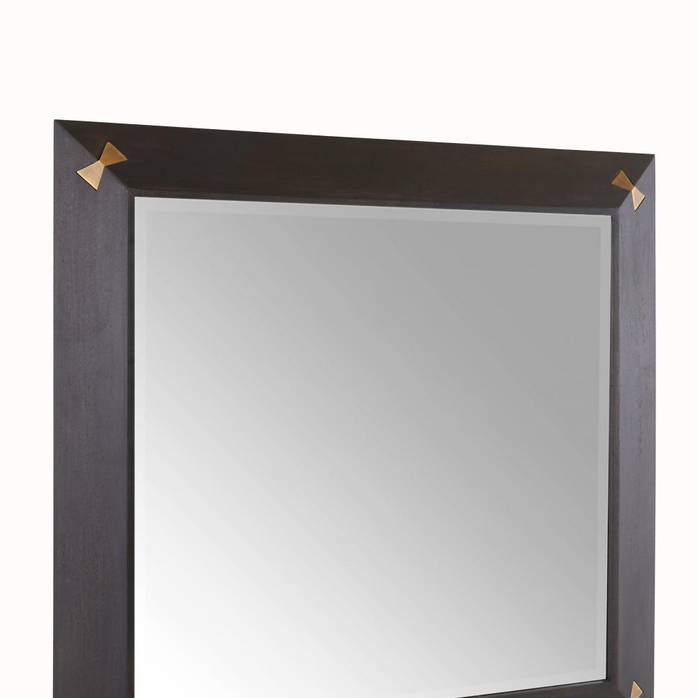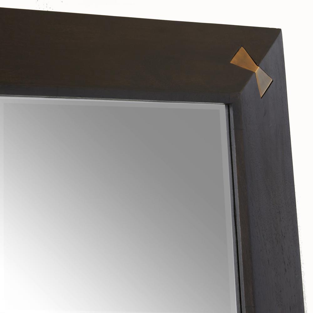 A polished sable mango wood frame is adorned with inlaid butterflies of antique brass to catch the light. The beveled mirror is held securely with dovetail joints, while each hinge lies flush within the frame for a smooth finish. Designed to be hung vertically, it is secured with a cleat at the back. Finish will vary.