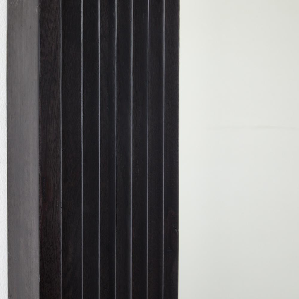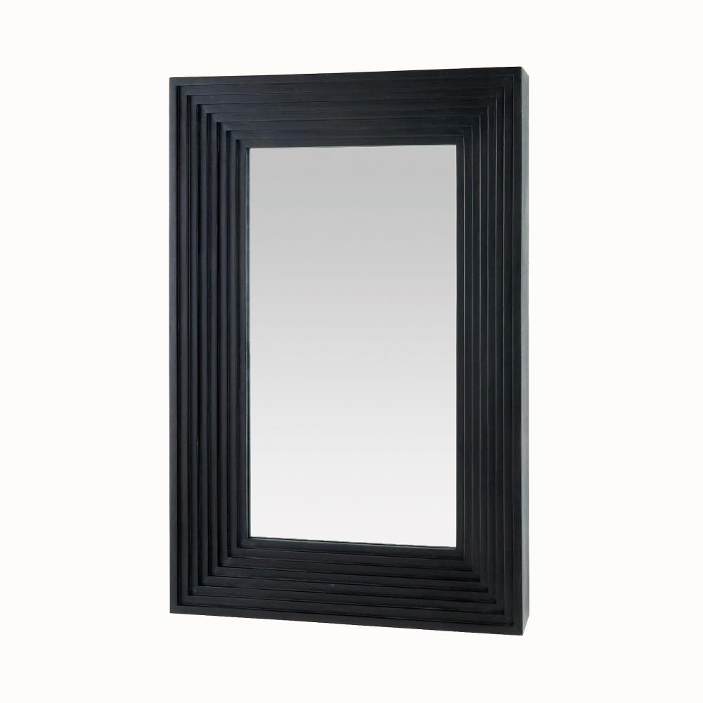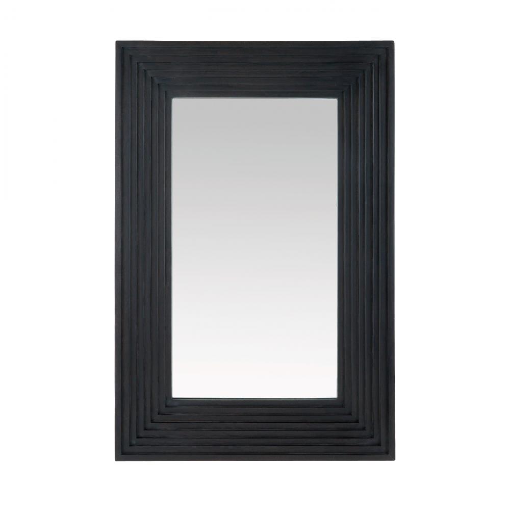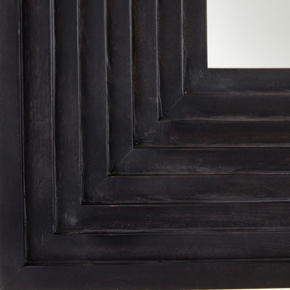 A minimal rectangular mirror is framed with stepped, muscular detailing carved to draw the eye. Crafted of mango wood of a rich ebony hue, our inverted style was designed to be hung horizontally or vertically. Accented with a secure cleat attachment at the back. Finish will vary.