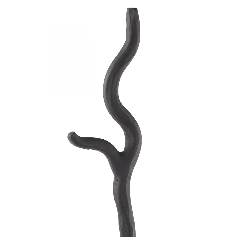 Inspired by medieval ironwork, a blackened, hammered iron toolset offers a playful and literal twist on a timeless hearth essential. The angular handles of the poker, shovel, and tongs entwine together in a form reminiscent of the twisted roots of a tree. A matching iron base complements the set. Designed to pair with the Denison Log Holder. Finish will vary.