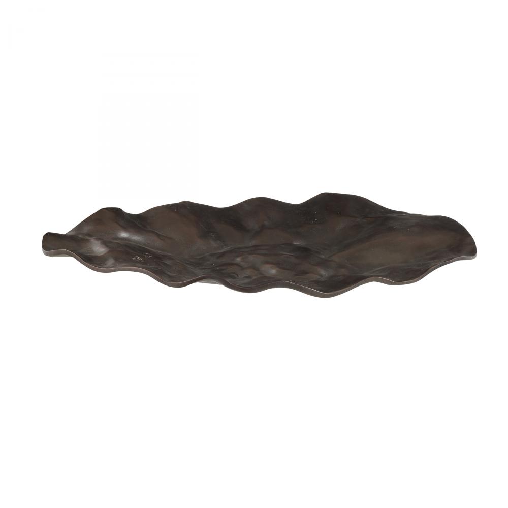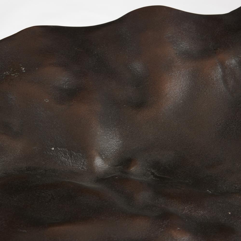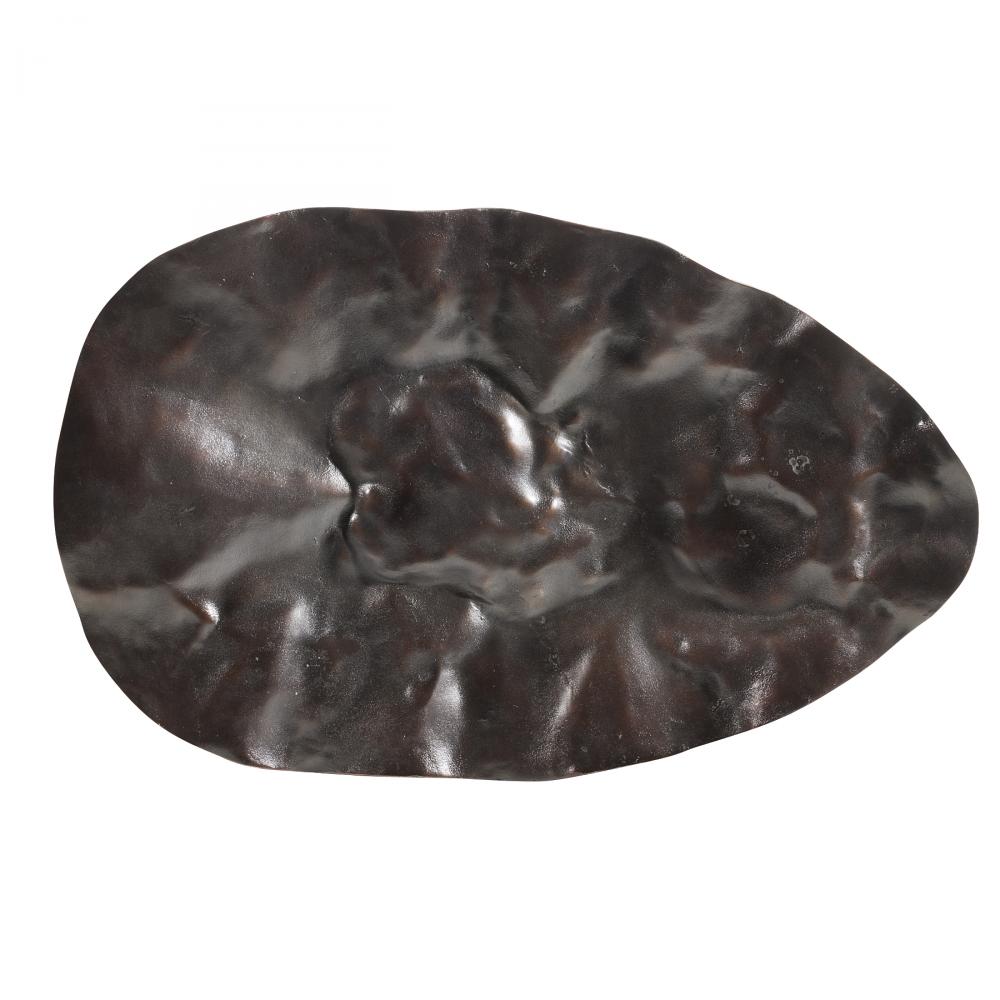 With a freeform hammered texture, this unique cast aluminum centerpiece resembles a crushed shield. Oversized to add drama, the antique copper surface delivers textural appeal. Finish will vary.
