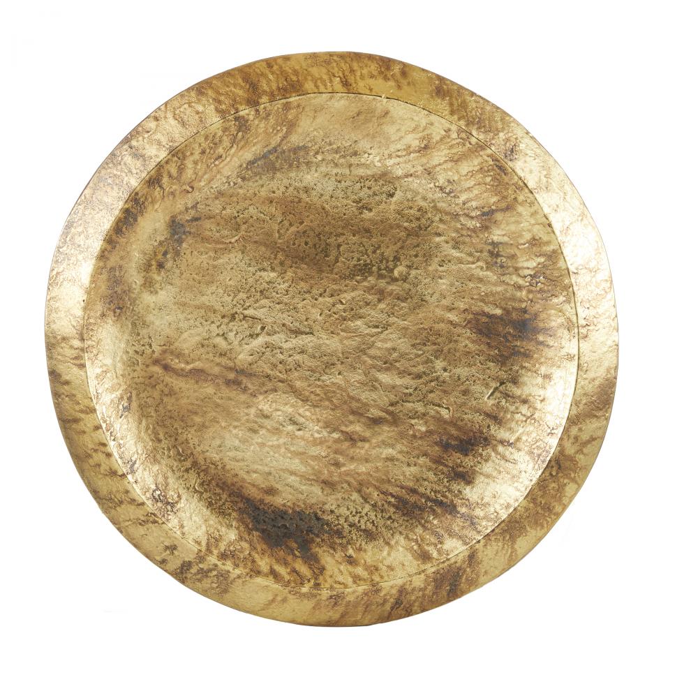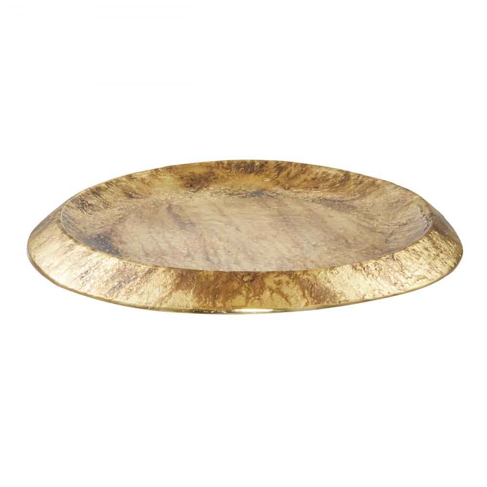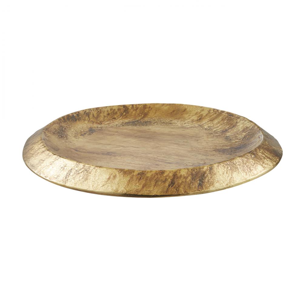 Simplistic in form, a shield of distressed antique brass is carefully aged to appear effortlessly burnished. We designed this cast aluminum centerpiece with a shallow dip and floating edges to make an over scaled home for your treasures. Finish will vary.