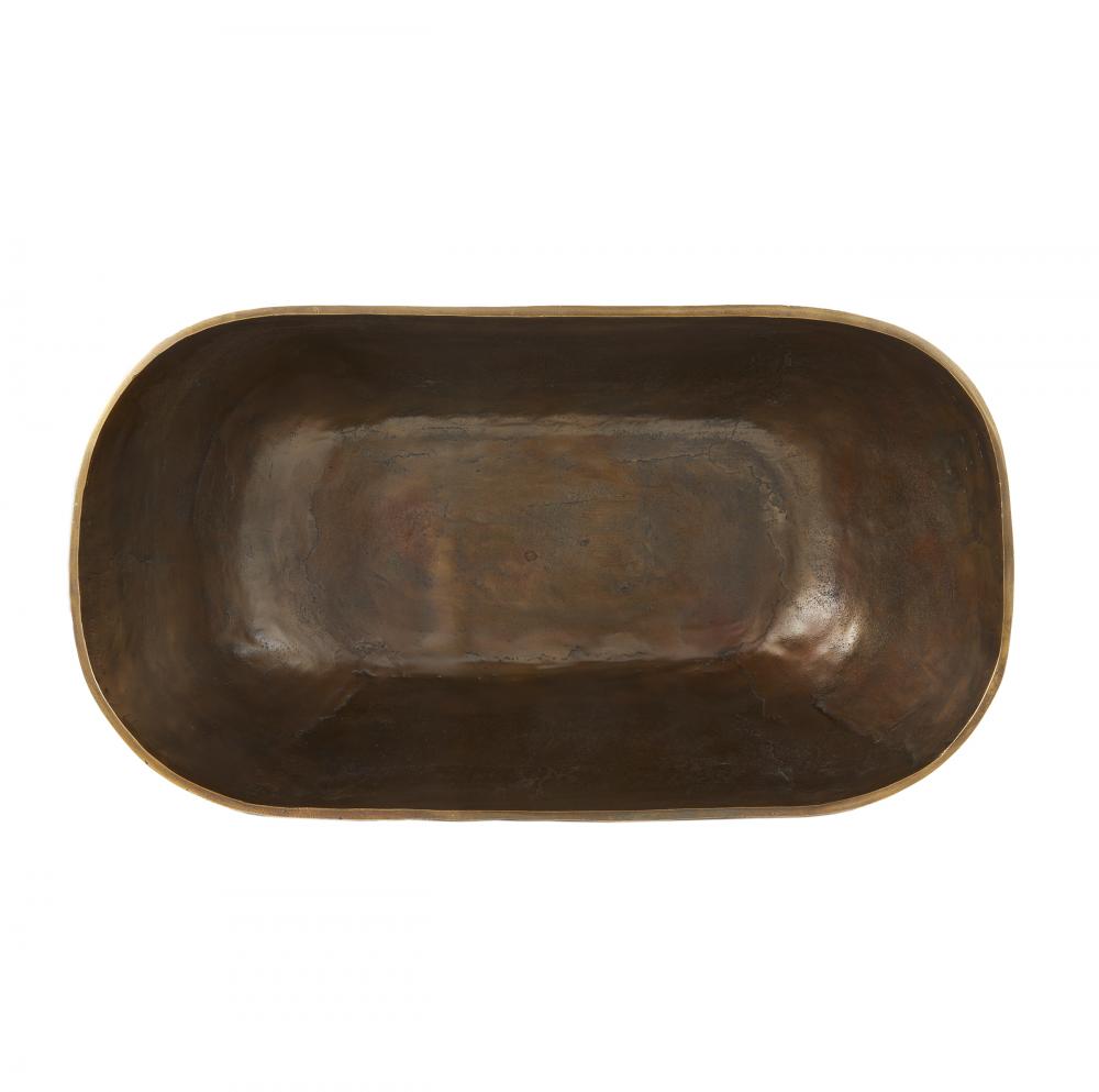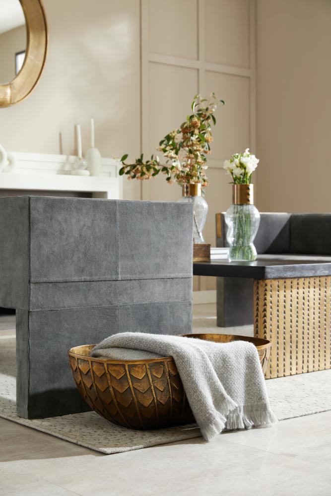 Plated in shimmering antique brass, this heavily textured cast aluminum centerpiece elevates any object placed inside. With an outer surface influenced by Nordic shingles, its Shaker-influenced facade gives Ezekial a sculptural appearance. Finished with a felted bottom. Finish will vary.