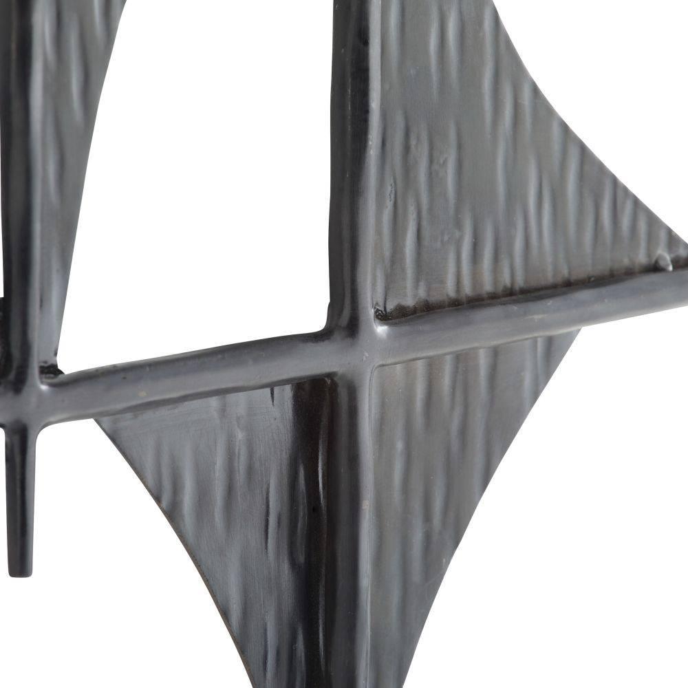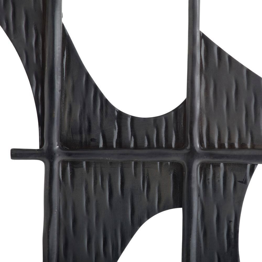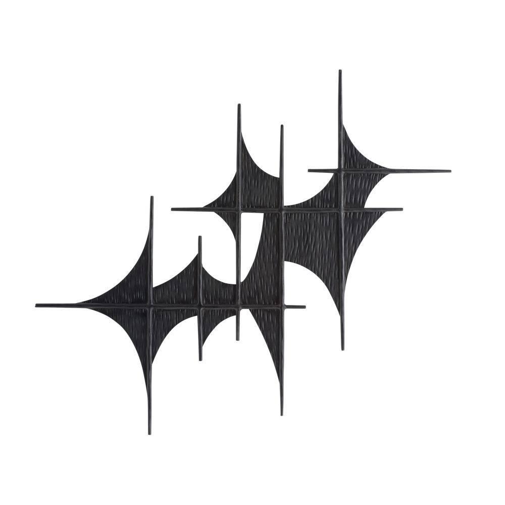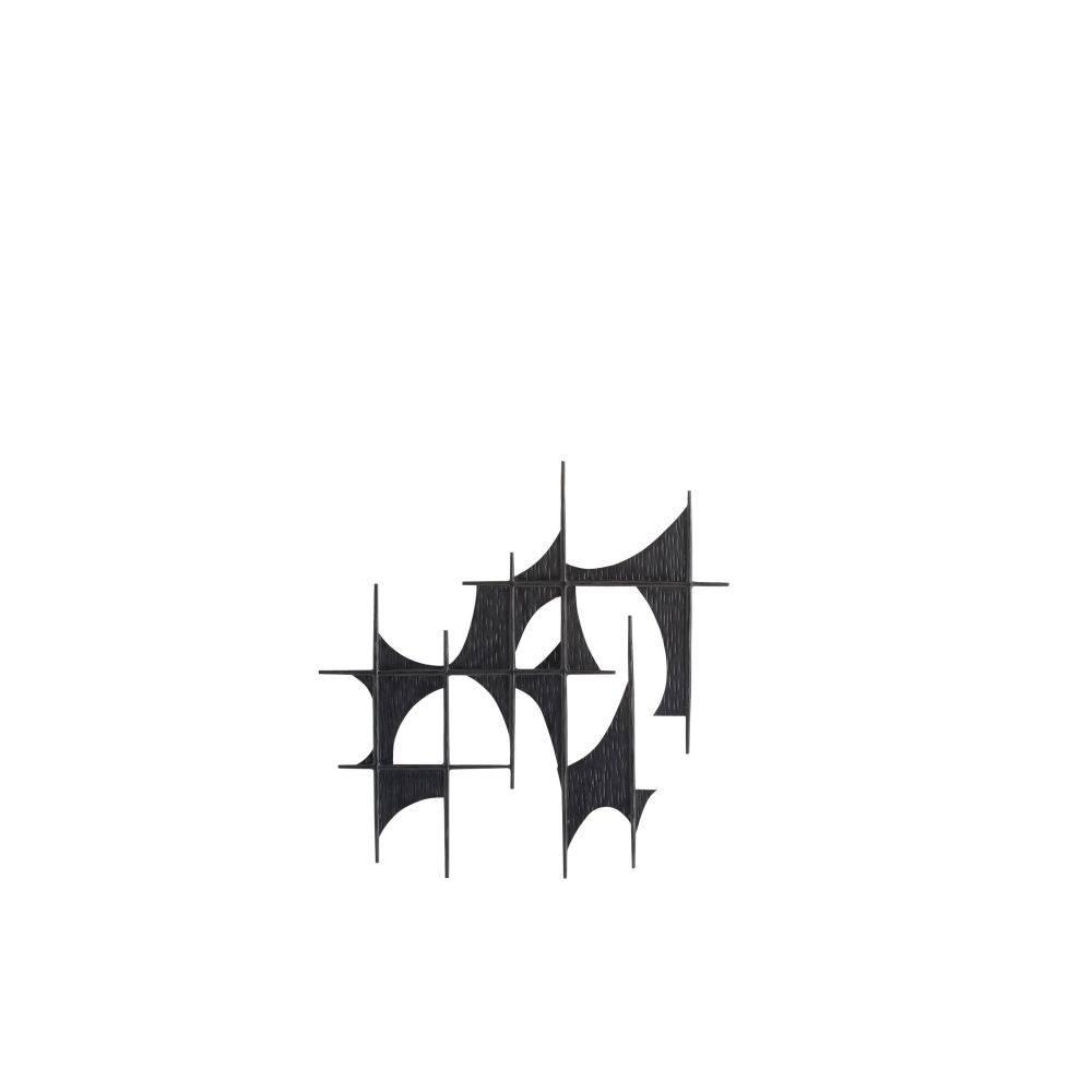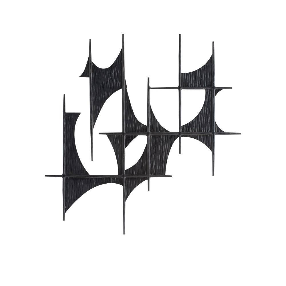 A trio of plaques of black-forged iron draw from the best of mid-century Brutalist forms. With the look of sails stretched between posts, the textured angles and curves are elegant on their own and even more impactful when displayed together. Arrange them in multiple ways to create a custom look. Keyhole attachment for secure hanging.