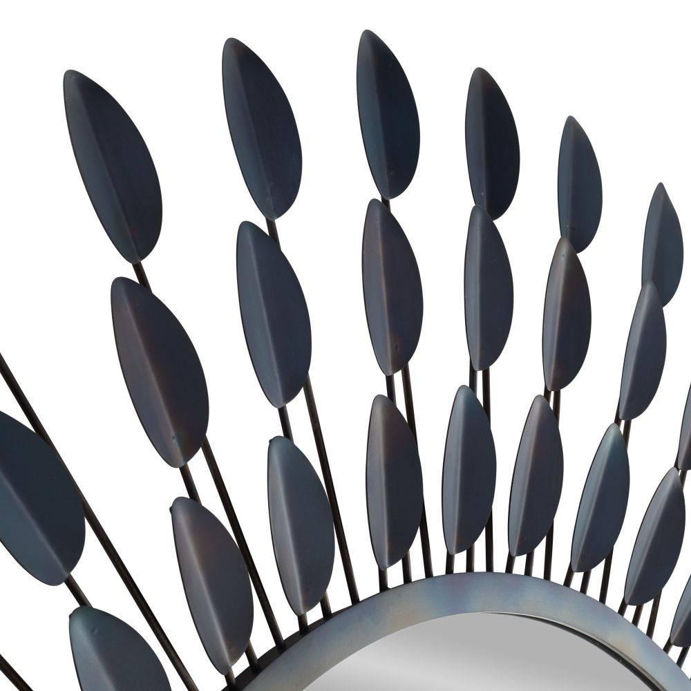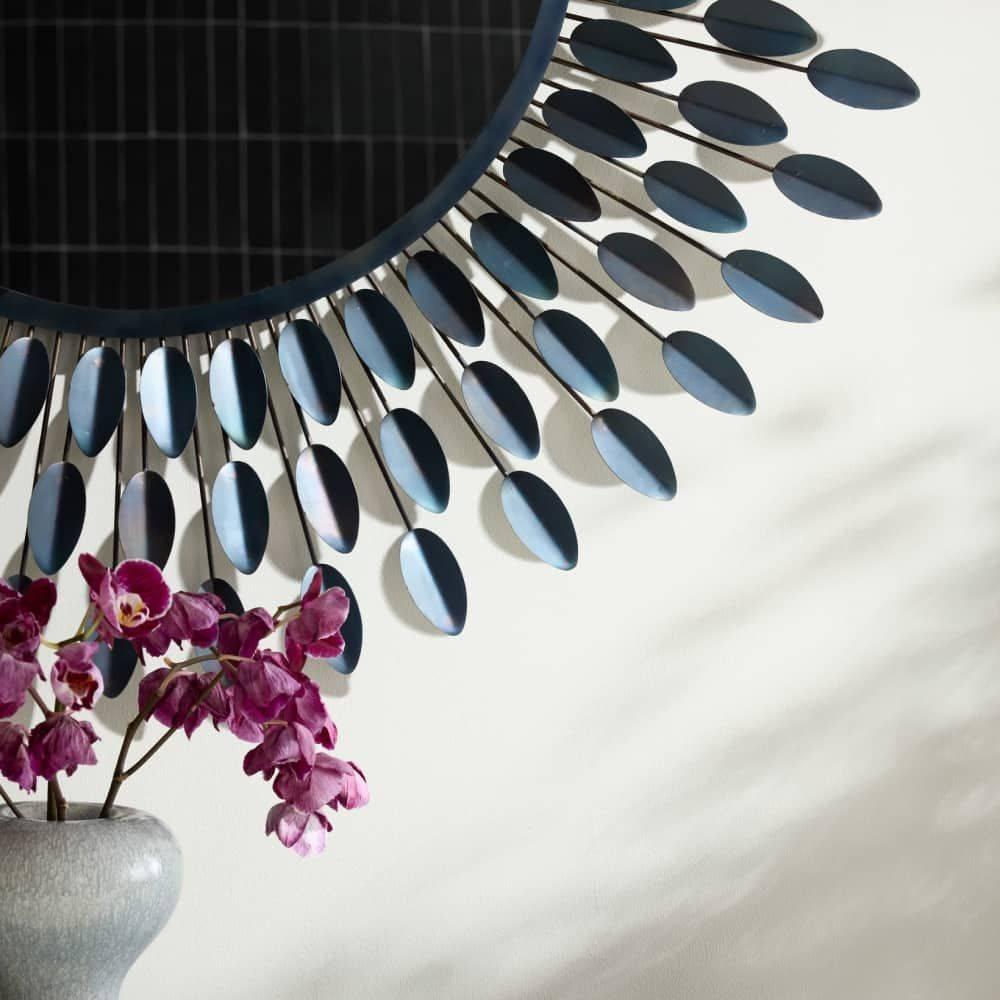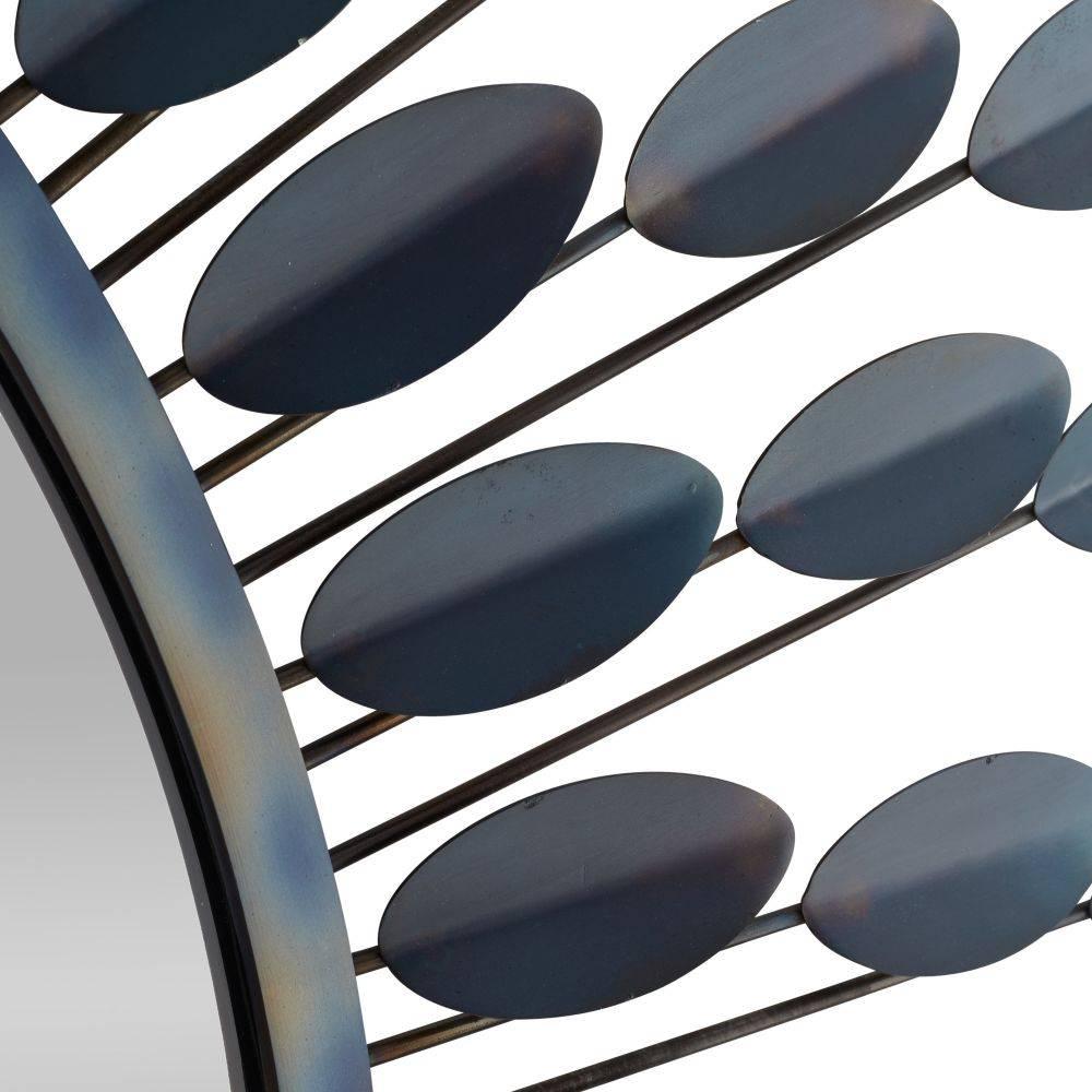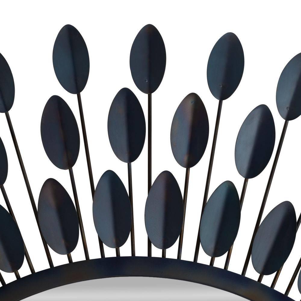 The extroverted form of a dahlia flower inspired our botanically influenced Frida. Crafted of burnt iron, the array of folded petals possesses a blue iridescent finish. Secured at the back with a cleat attachment. Finish will vary.