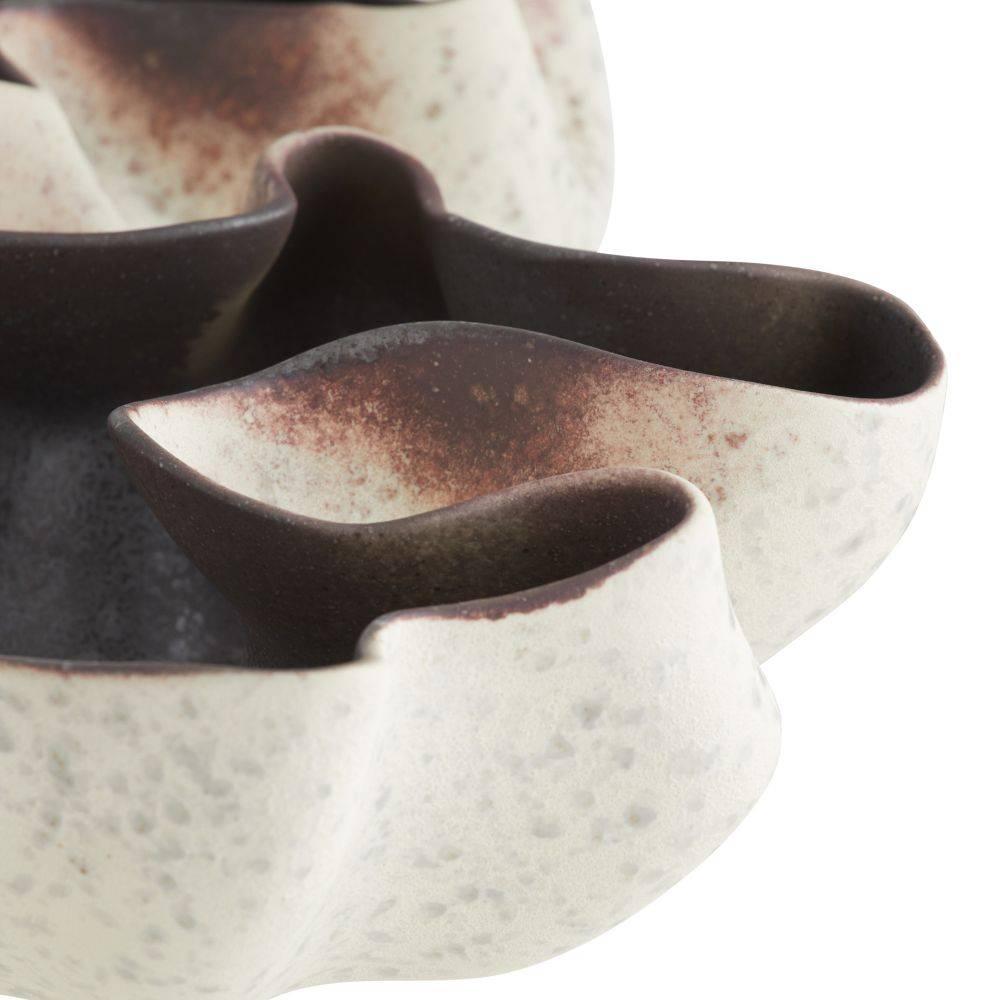 The free-form shapes of branching coral are echoed in a dramatic porcelain centerpiece. Glazed in our new sparrow reactive shade with a gunmetal reactive interior, the mix of hues results in a bleed of oxblood accents along each sinuous seam. Finish will vary.