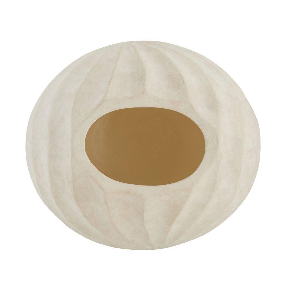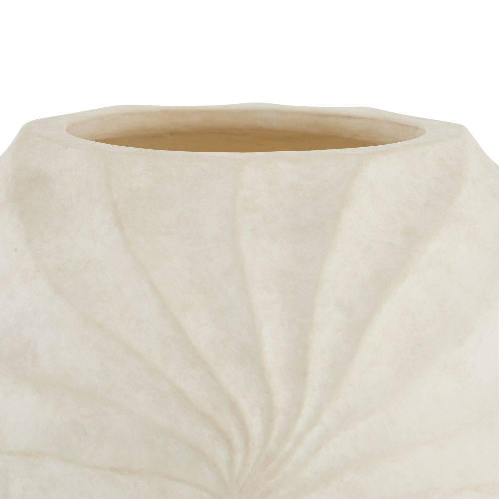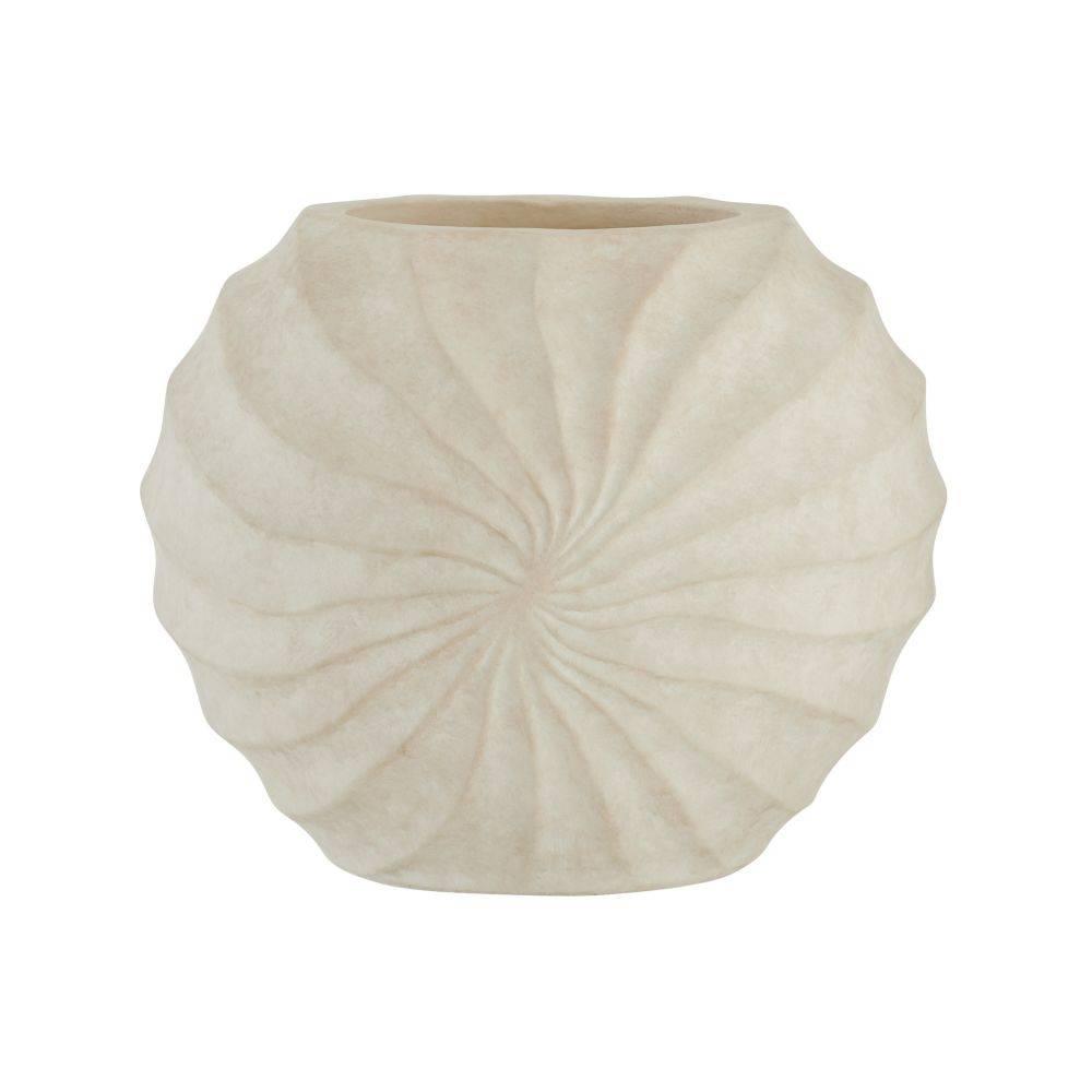 The rippled and rhythmic patterns of a Nautilus shell find a visual echo in a vase of eggshell-glazed terracotta. Each ridge of the hand-sculpted form spirals together to create a striking, contemplative piece. Finish will vary.