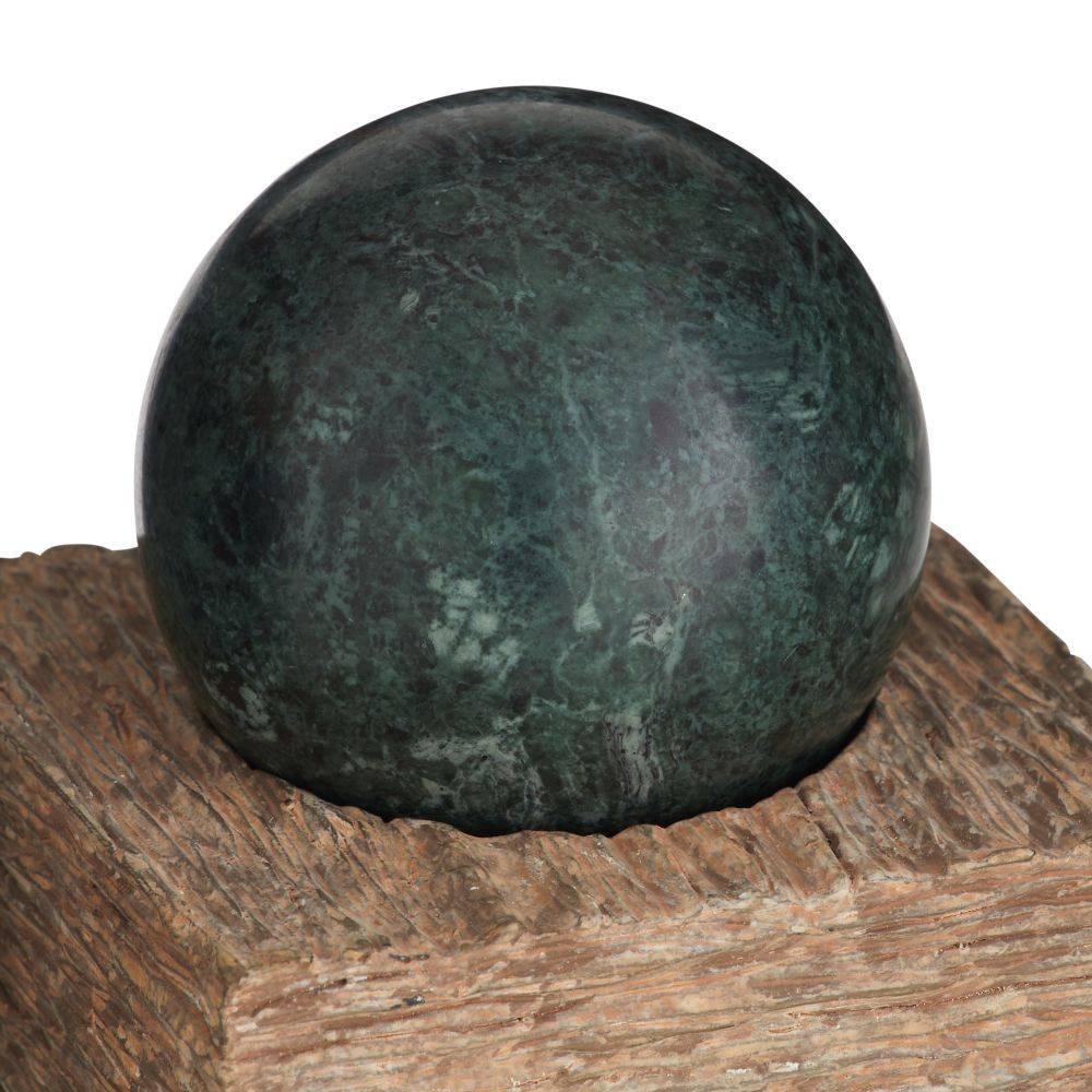 Monolithic resin pedestals of ash brown and graphite tones are the ideal base for this set of mixed-material forms. Textured with daubs and grooves, each sculpture is topped with a polished marble sphere in a contrasting forest or chamois shade. Can double as a stylish storage compartment for small items. Finish will vary.
