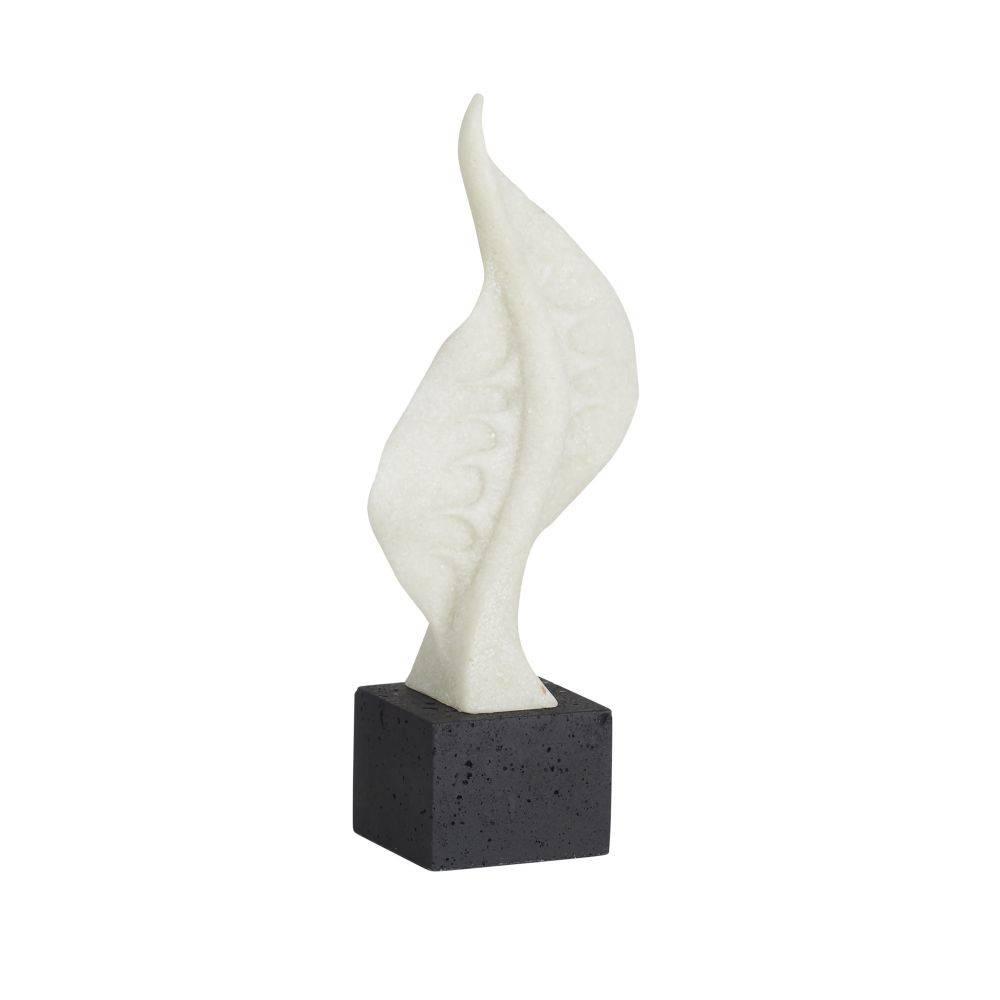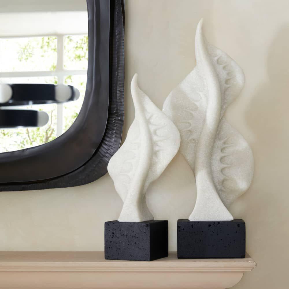The sculptural silhouettes of marine life are reflected in these ivory ricestone composite sculptures. Reminiscent of seaweed or a Portuguese man-of-war fin, each twisted form stretches upward while secured to a charcoal ricestone composite base. Finish will vary.