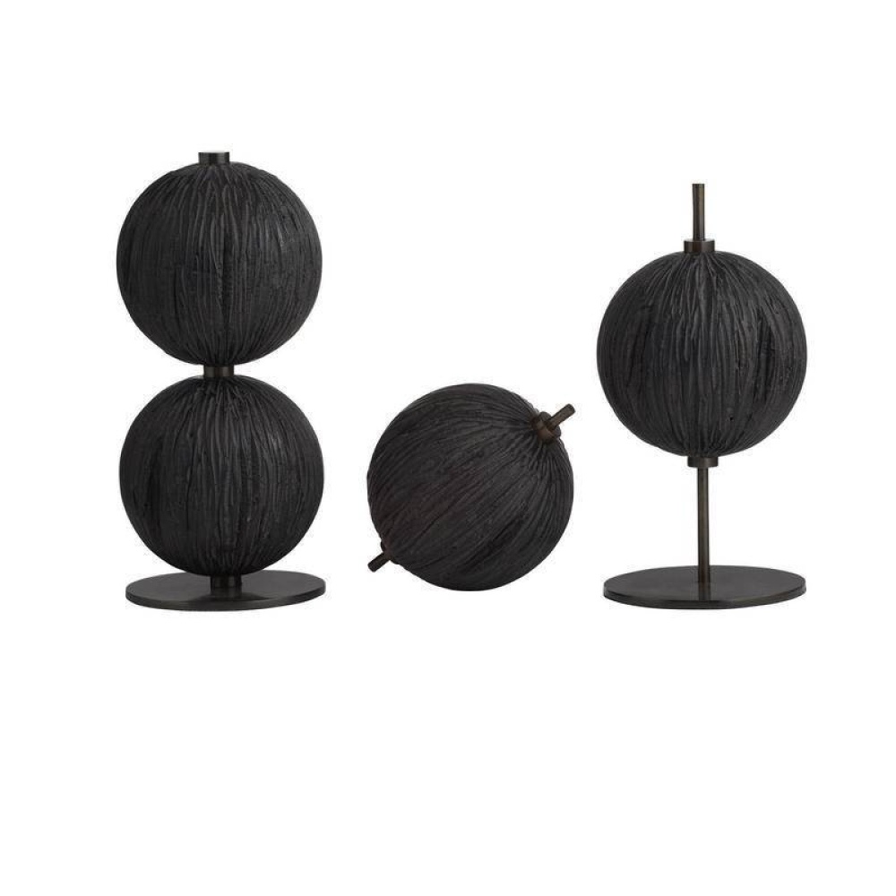 This set of organic forms is inspired by Japanese shou sugi ban is reinterpreted in ebony resin. Each rounded sculpture is reminiscent of a seed pod, pierced with an accent English bronze steel. Two of the trio are mounted securely on a base.