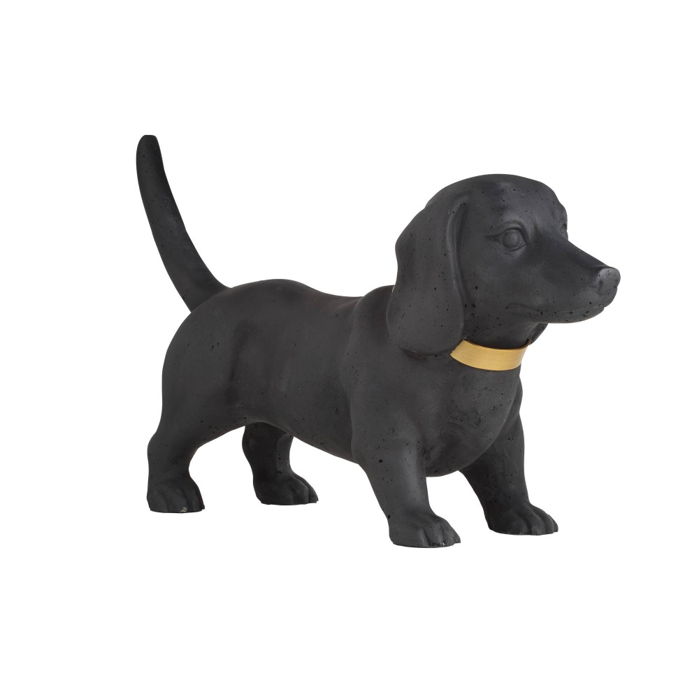 Designed for canine enthusiasts, this cast charcoal ricestone composite pup adds a playful, whimsical touch to any space. Its neck is accented with a polished antique brass iron collar. Finish will vary.