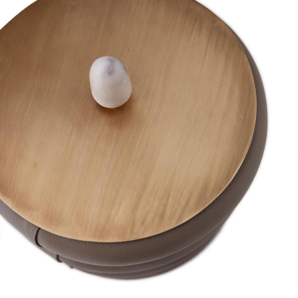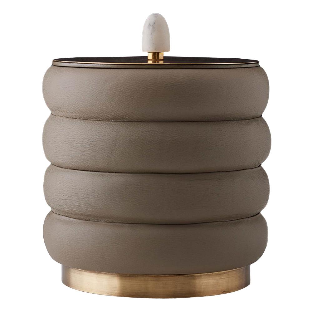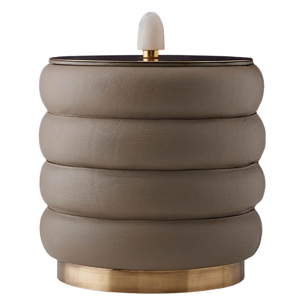 WE INTRODUCE A LUXE TAKE ON THE TRADITIONAL ICE BUCKET. THE VALEN IS IMAGINED IN CHANNELED DOVE LEATHER AND ADORNED WITH ANTIQUE BRASS, WHICH FORMS THE LID AND PLINTH. THE RECEPTACLE IS FURTHER EMBELLISHED WITH A WHITE MARBLE FINIAL. THE STRIKING BAR COMPANION FEATURES A STAINLESS-STEEL LINER, MAKING IT WATERTIGHT, AND COMES WITH MATCHING LEATHER AND STAINLESS TONGS. FINISHES WILL VARY.
