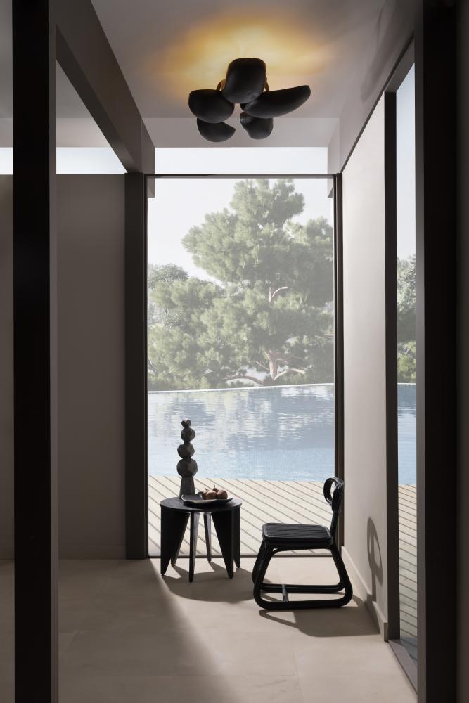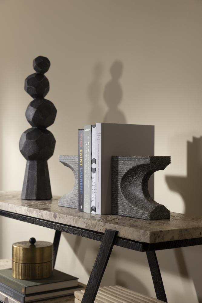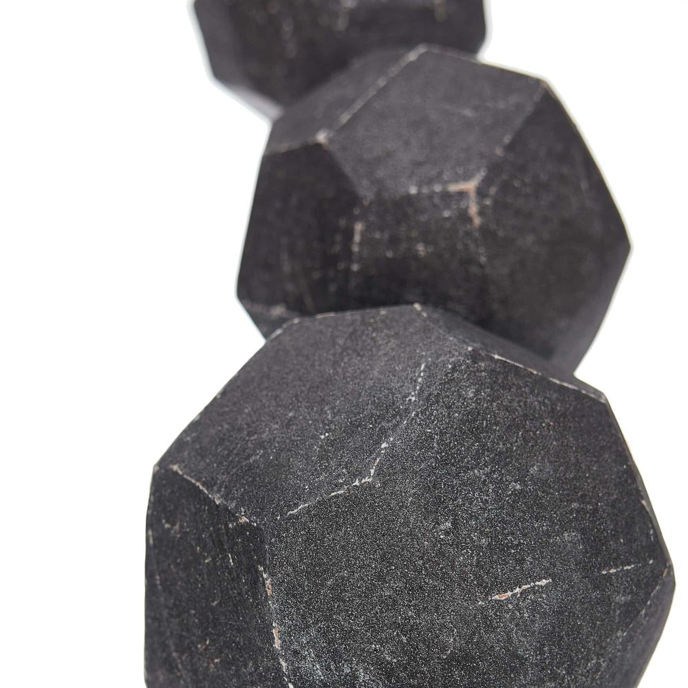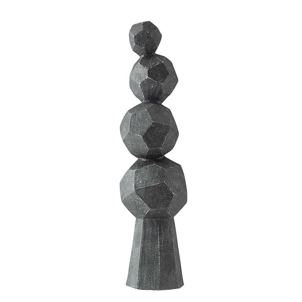 THE TOTEMIC WILMOT SCULPTURE IS DESIGNED IN A STACK OF FACETED, CHARCOAL TERRACOTTA SPHERES THAT BALANCE ON A CARVED PLINTH. INSPIRED BY GEODESIC DOMES, THE VERTICAL CERAMIC SCULPTURE IS AT ONCE EARTHY AND MODERN.