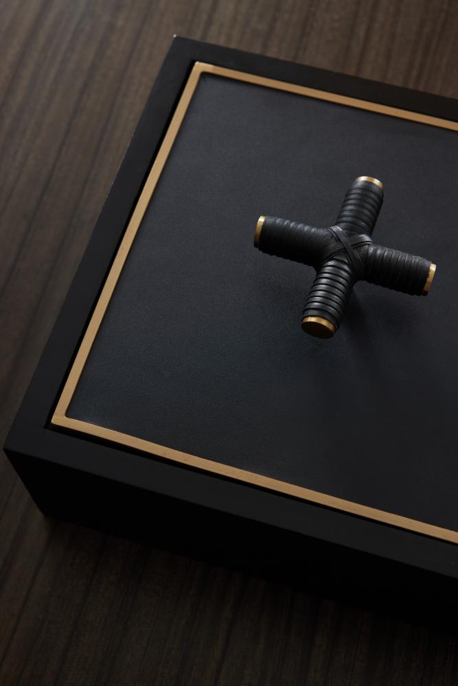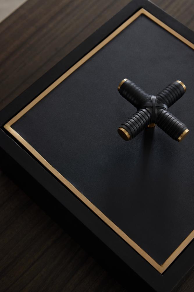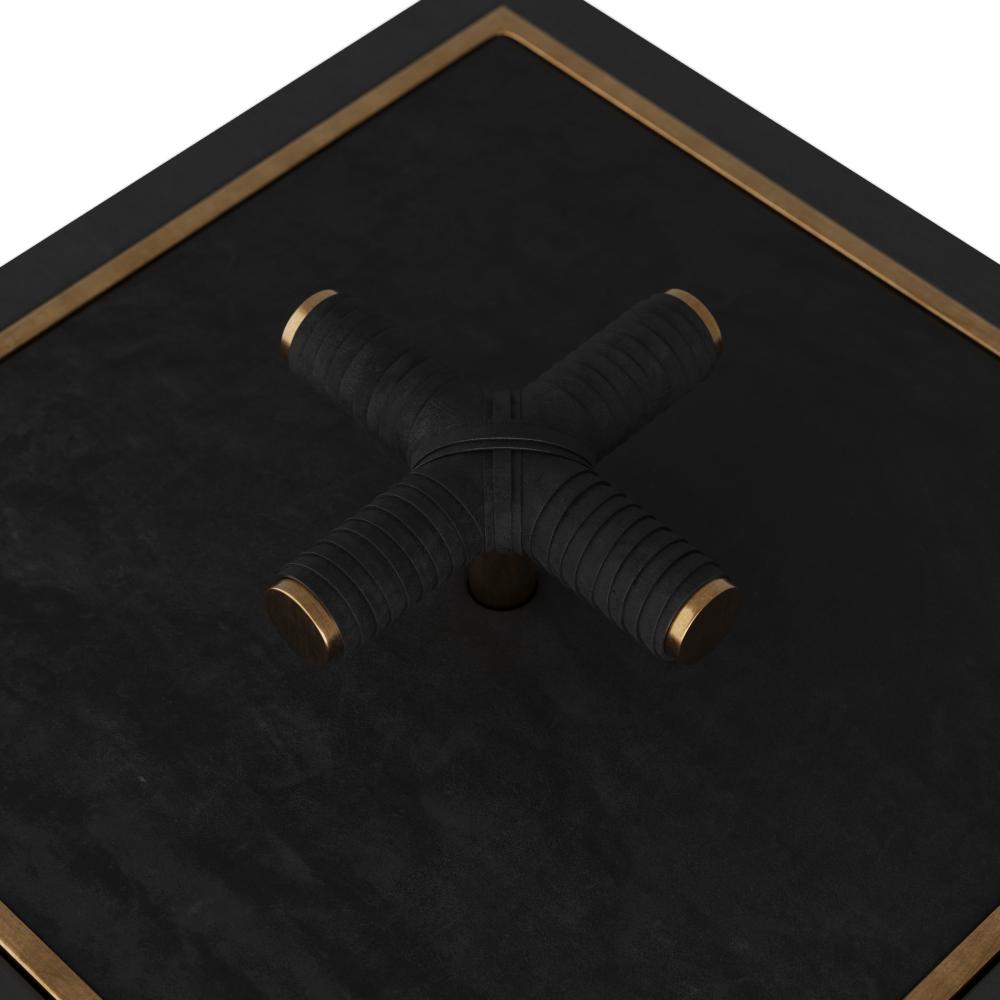 A stylish storage element for any room. The Xander is made of ebony stained wood with an inset bezel of antique brass. Topped with a beautiful black leather-wrapped brass criss-cross handle for easy opening. Finish will vary.