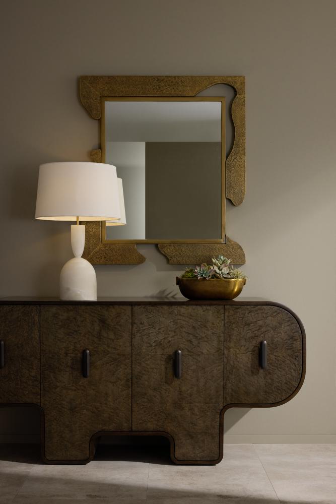 An abstract work of art, the free-flowing frame of Zayden is finished in antique brass. Reminiscent of a puzzle piece, this textural style is left intentionally asymmetrical to enchant the eye. Security cleat hardware allows vertical or horizontal placement. Finish will vary.