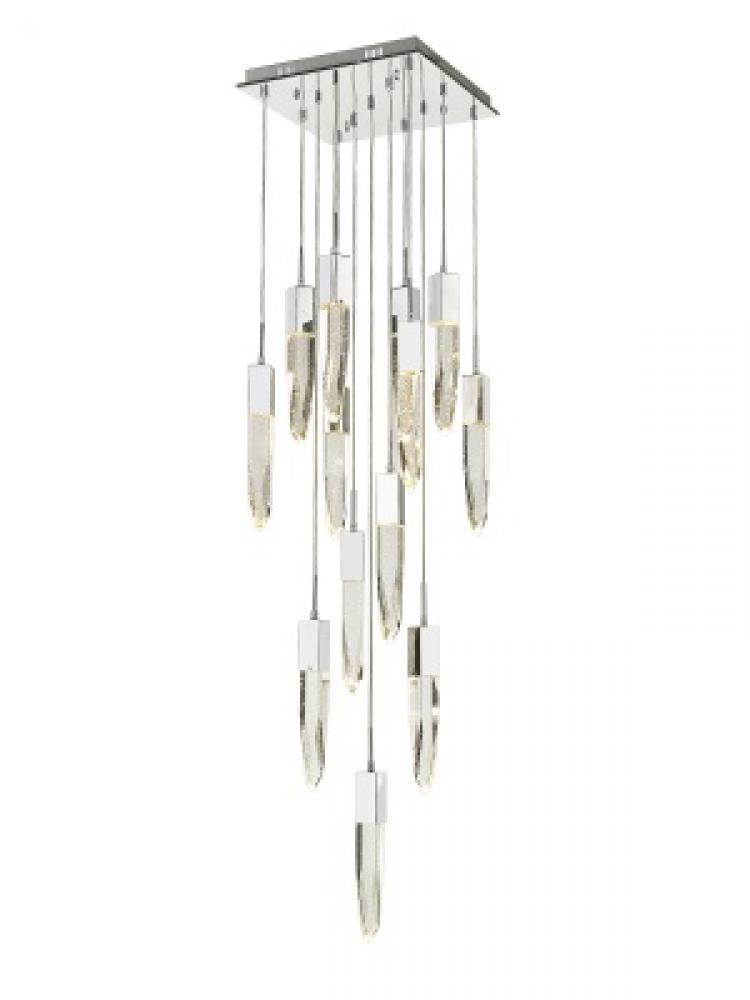 The Original Aspen Collections magnificent cascading LED points encased by hand polished solid clear bubbled crystals will give your space a very dramatic modern feel. This 13-light cluster chandelier in chrome is perfect for any space.