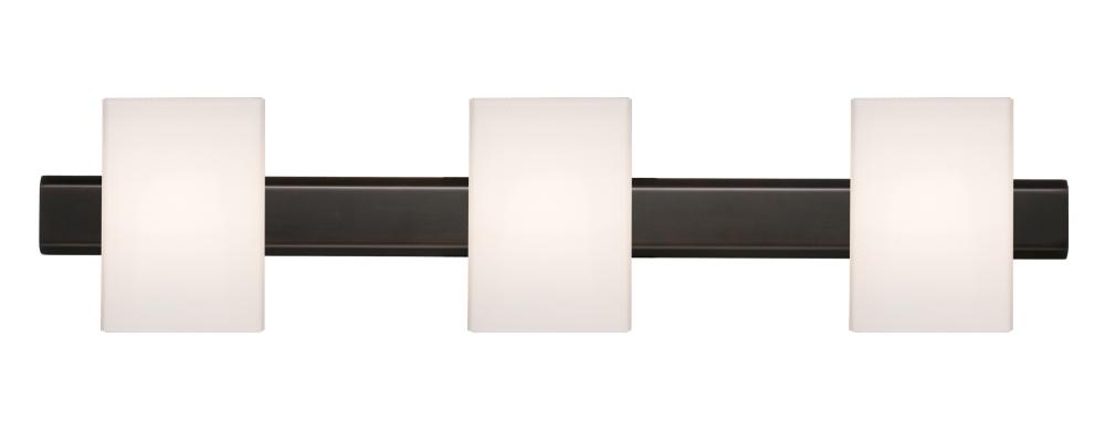 The Tito vanity is a simple, contemporary bath bar featuring handcrafted Opal glass on a low profile plated bracket. Our Opal glass is a soft white cased glass that can suit any classic or modern decor. Opal has a very tranquil glow that is pleasing in appearance. The smooth satin finish on the clear outer layer is a result of an extensive etching process. This modern wall light offers flexible design potential for a variety of bath/vanity decorating schemes. These stylish and functional luminaries are offered in a beautiful brushed Bronze finish.