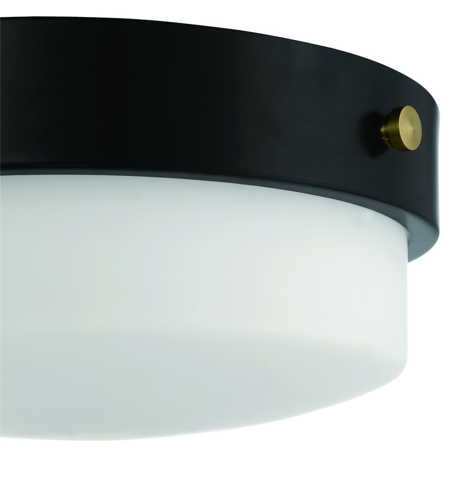 The Oak Street Collection , inspired by strength of classic turn of the century lighting, features a striking combination of sleek metal and white frosted glass in your choice of brushed polished nickel or flat black. The flat black finish includes brushed polished nickel, flat black and satin brass knobs to customize your look. The Oak Street Two Light Flushmount Collection is available in 11" and 13" diameter and each uses two 60W medium base bulbs.