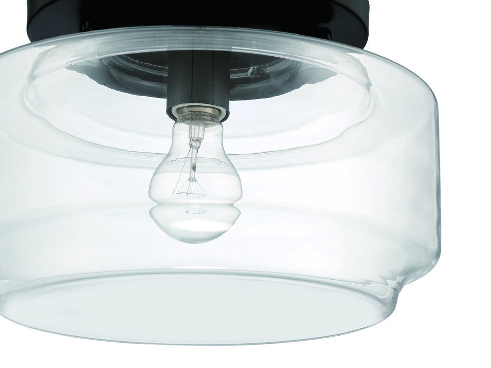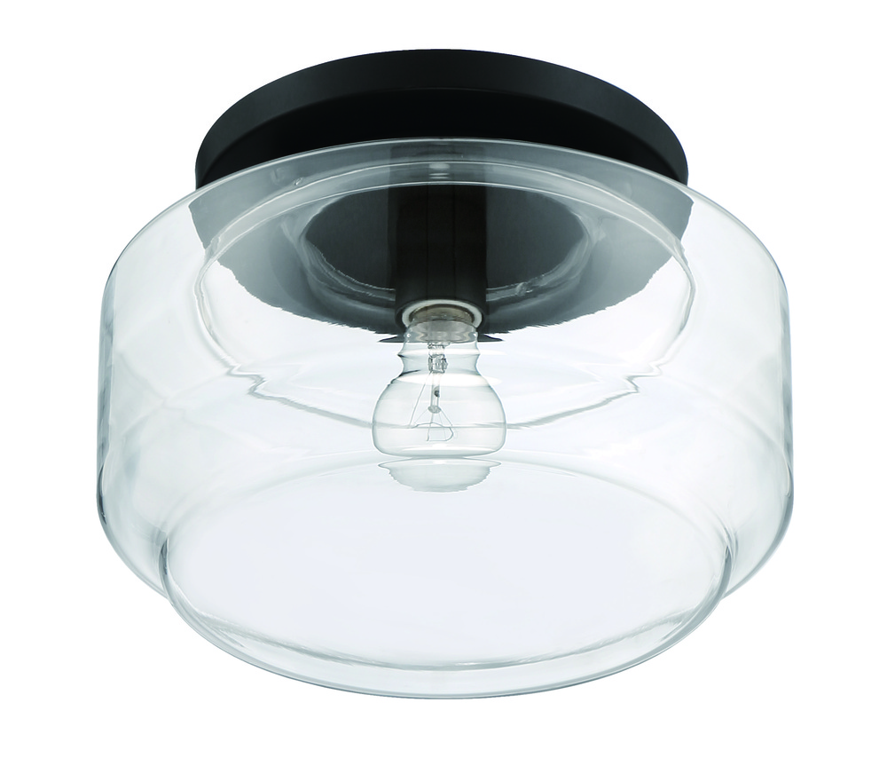 The Peri Collection , inspired by classic schoolhouse lights, features a wide clear glass globe in a familiar yet updated shape. Finished in your choice of brushed polished nickel, flat black or satin brass, these flushmounts are available in 12" and 14" diameter and each uses a single 60W medium base bulb.