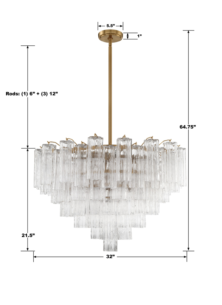 The captivating Addis Lighting Collection is a modern-day interpretation of the iconic mid-century Tronchi chandelier. Inspired by its predecessor's sleek lines and geometric shapes, the Addis features a polished Chrome or Aged Brass metal frame that exudes sophistication and style. Its unique design showcases transparent tiers of textured Tronchi glass tubes, forming a mesmerizing 5-point rounded star shape. Choose from a range of glass colors, including clear, amber, smoke, and white, or the stunning Autumn option, which features a captivating multicolor disposition of amber, clear, and smoke Tronchi glass. The Addis Lighting Collection offers various sizes and finishes, allowing you to find the perfect fit for your space while adding a touch of timeless elegance.