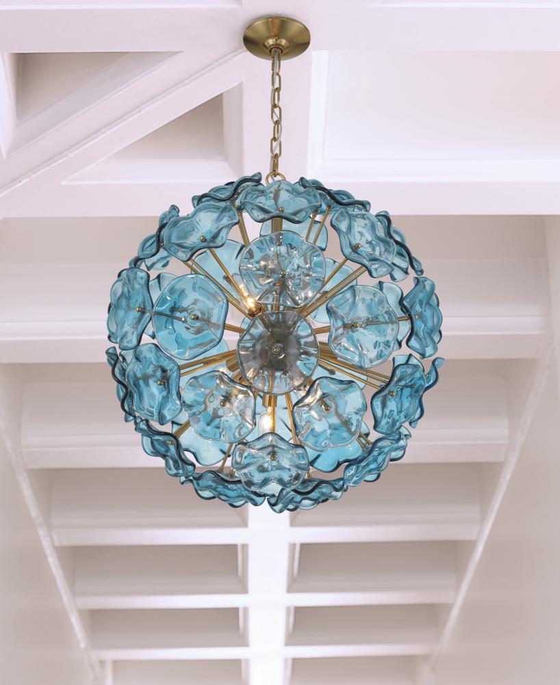 The Esme collection is a modern take on the iconic Sputnik design, blending vintage sophistication with a fresh, dynamic twist. Its spherical core anchors an array of brass rods extending outward, culminating in hand-blown art glass shaped like delicate flower petals. This striking piece transforms a room, offering a different visual experience whether it's illuminated or not—sophisticated and bold when off, subtly whimsical and glowing with warmth when on. Esme's timeless charm and playful elegance stand out in any space.