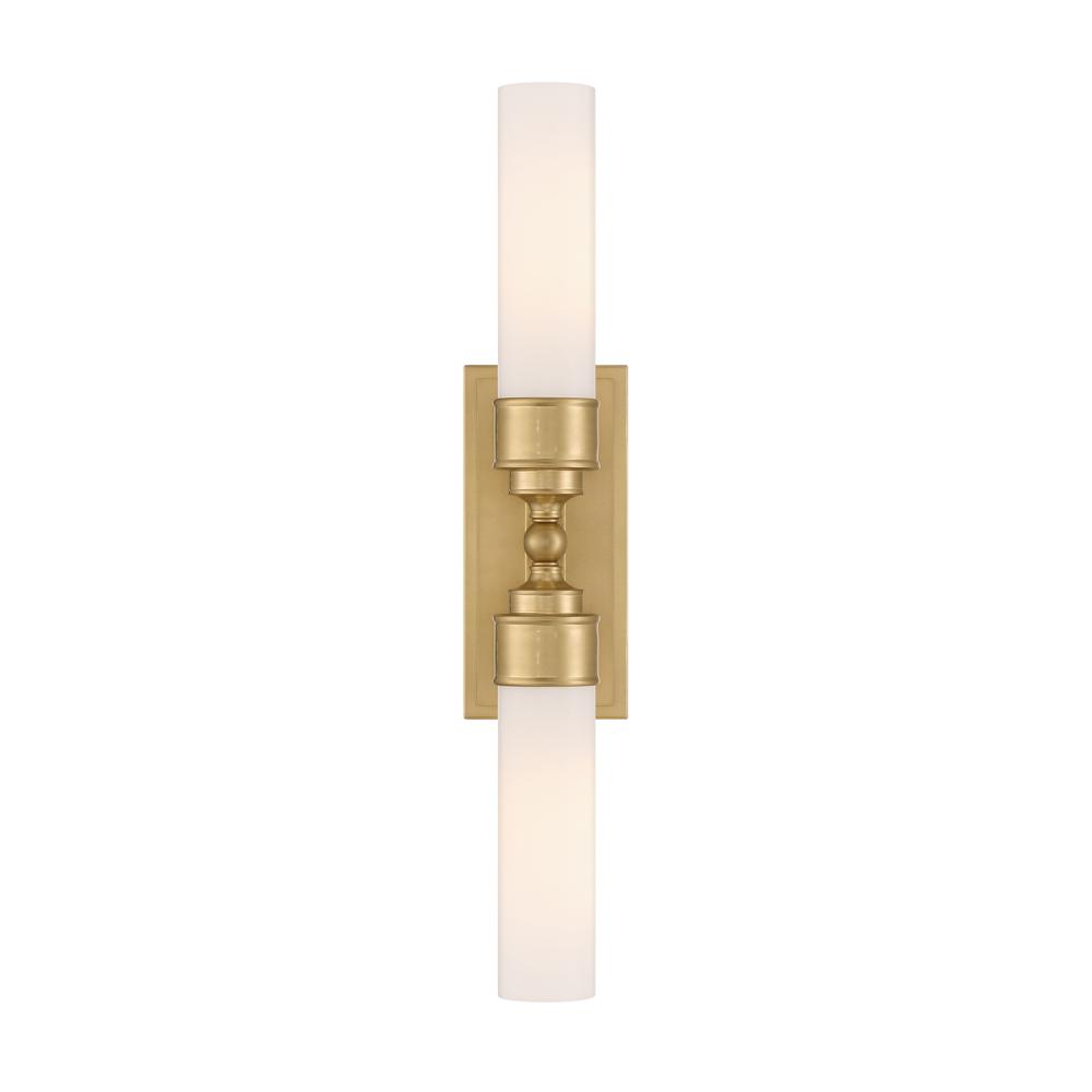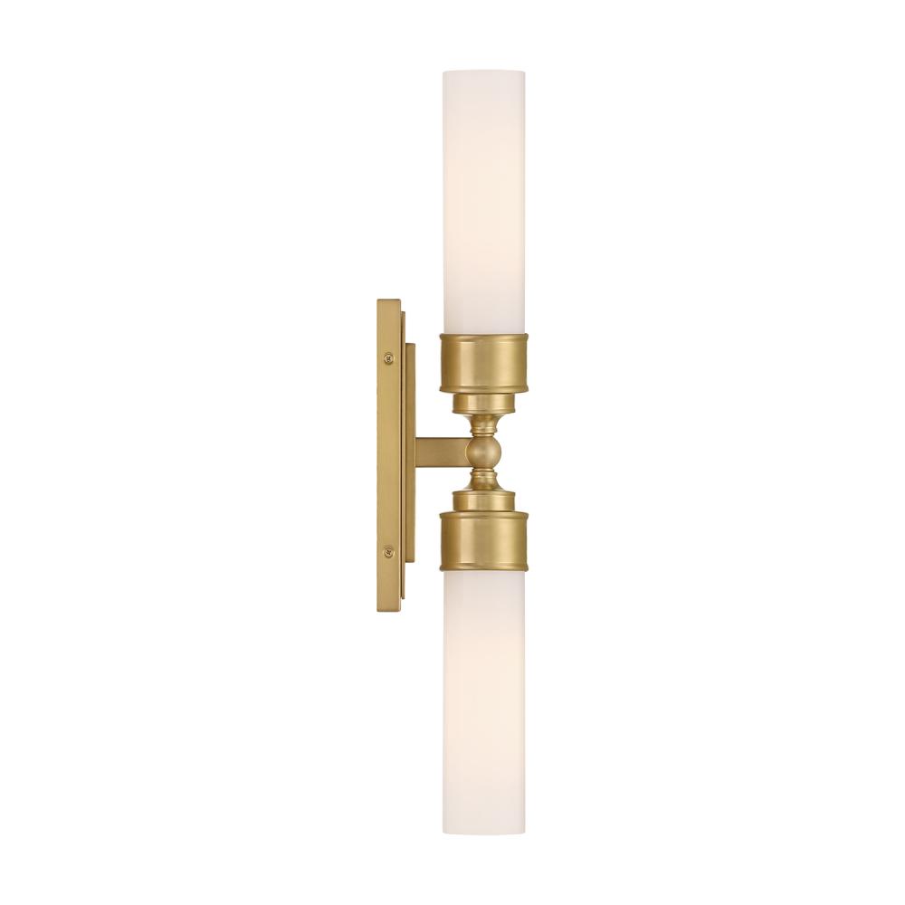 The Wilcox collection includes a white cylindrical glass shade and a rectangular back plate with stepped detailing. It is damp-listed for safe use in moisture-prone areas. The collection offers a single light option, suitable for mounting on either side of a mirror, and a double light option, perfect for placing over a vanity. This elegant fixture adds a sophisticated touch to bathroom spaces.