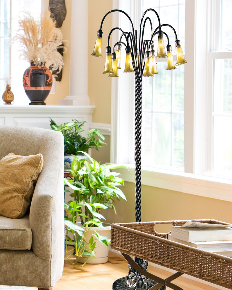 The shade of the 12-Light Gold Lily Floor Lamp is hand blown using the finest art glass. The colors and shape of the 12-Light Gold Lily Floor Lamp will not just illuminate but decorate any space in your home.