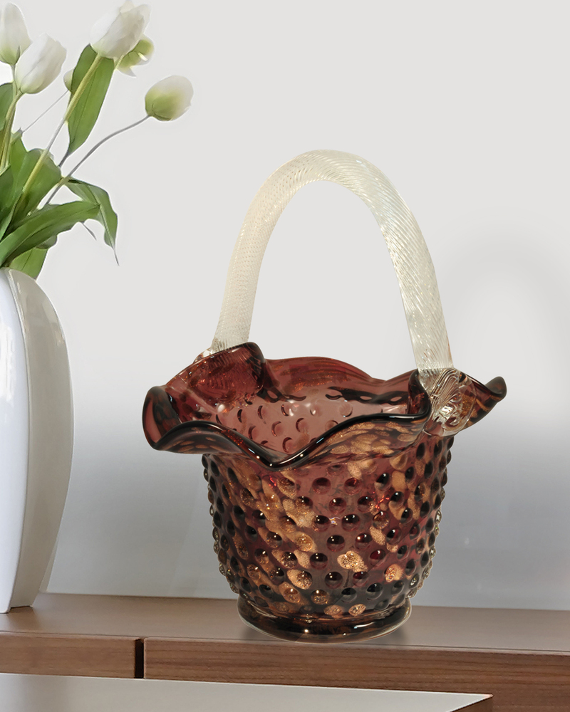 A tisket, a tasket, you’ll love our Purple Basket in any room of your home. Always at the forefront of home decor trends, Dale Tiffany is pleased to present this delightful Favrile home accent. Standing just under 1 foot in height, the basket is hand blown in purple Favrile bubble glass. We have added a dotted texture, which combined with the bubbling, creates a realistic texture. The gracefully arched handle is clear glass with a ropelike texture for an even more realistic feeling. A delightful accent piece in a bedroom, powder room, living room or office, our Purple Basket is an artistic way to display your little treasures or corral little necessities that you will proudly display for many years to come.