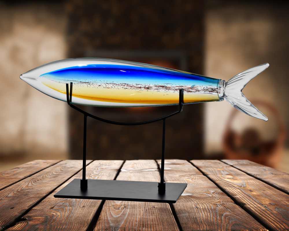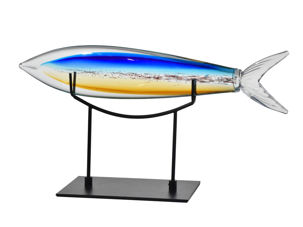 This large Fish Sculpture is a commanding presence in any room, no bait or hooks required. Standing at over 2 feet long, the beautiful fish features a center of amber, black and blue that has been texturized to create the illusion of scales. Surrounding the center is a large clear fish, complete with a realistically authentic split tail fin. The entire sculpture is crafted of hand blown Favrile art glass. The Favrile Process embeds the color within the glass itself. This allows for subtle variations of color and shape and ensures that yours is a one of a kind work of art. The included black metal display stand allows you to display your catch on desks, coffee tables or curio shelves. The perfect gift for the fisherman in your life, our large Fish Sculpture is always fresh, ensuring it will be displayed and enjoyed for years to come.