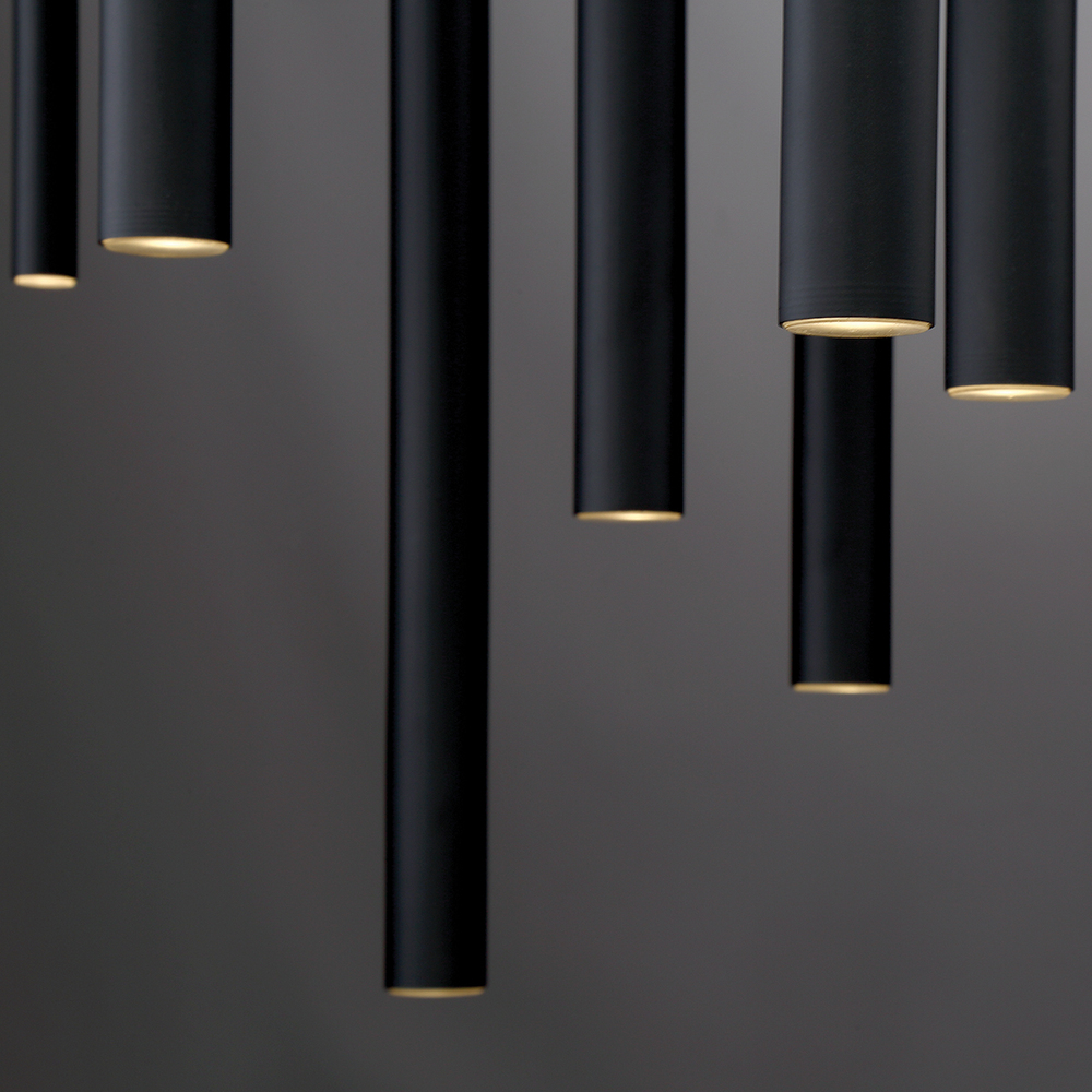 An assortment of tubes suspended at different lengths and thicknesses to create a visually dynamic composition. The aluminum rods house LED lights at one end for collective spot lighting while adding a playful twist to its minimal design.