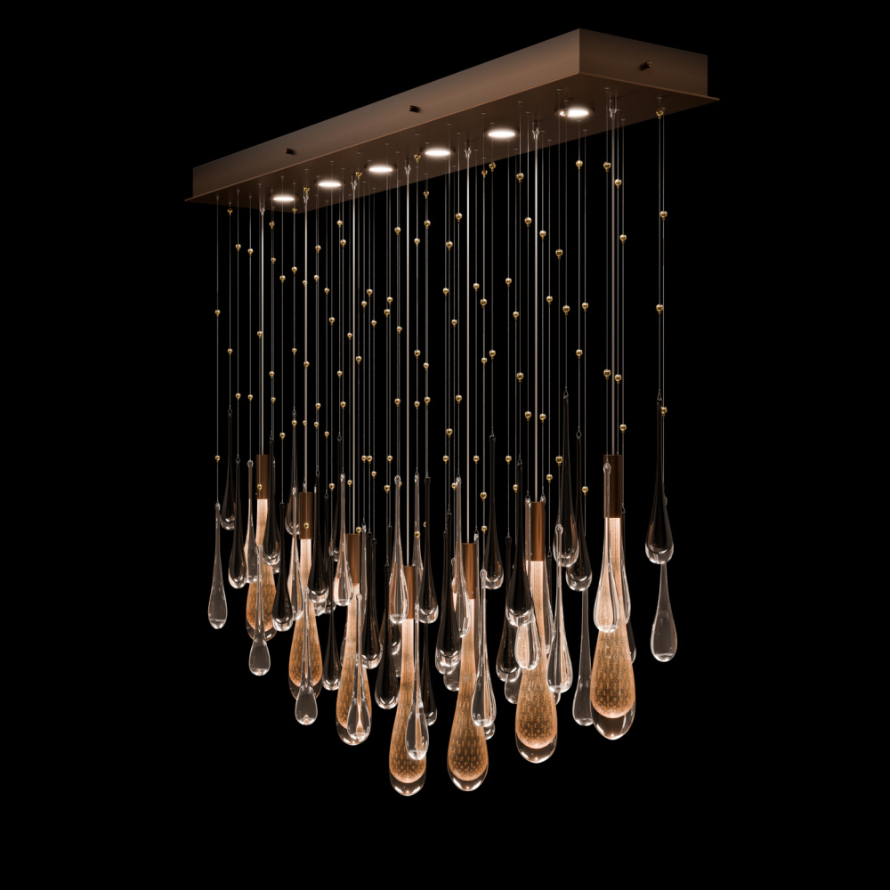 This LED pendant captures the beauty of motion suspended in time-artisan-blown glass “rain” drops infused with swirling mist and illuminated from within. Offered in Silver, Gold, or Copper drops, each paired with clear and black droplets and complemented by a hand-applied ombré finish that enhances its luminous depth.