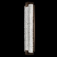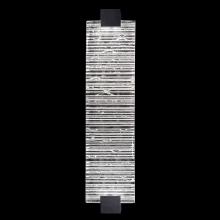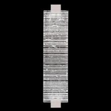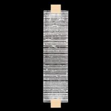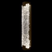 Indoor aluminum sconce features a three-dimensional contrast of deep textured and polished cast glass. This stunning landscape of the glass, illuminated by waterproof LEDs, is available in clear (shown) or highlighted with antiqued gold leaf. Choice of three finishes, champagne tinted gold leaf finish or silver leaf for indoor only, and a hand rubbed black iron for indoor and outdoor use.