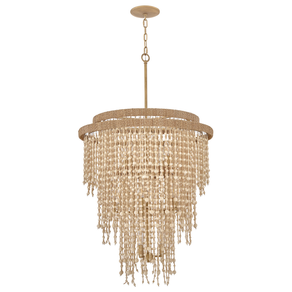 Juxtaposing unconventional materials and naturally inspired detailing with the timelessness of traditional tiered chandeliers, Freya’s cascading shade is draped with intricate beadwork. Individual strands of wooden beads are hung from hand-painted Burnished Gold frames to form bohemian curtains that cast beautiful shadows from warm candelabra lamps.