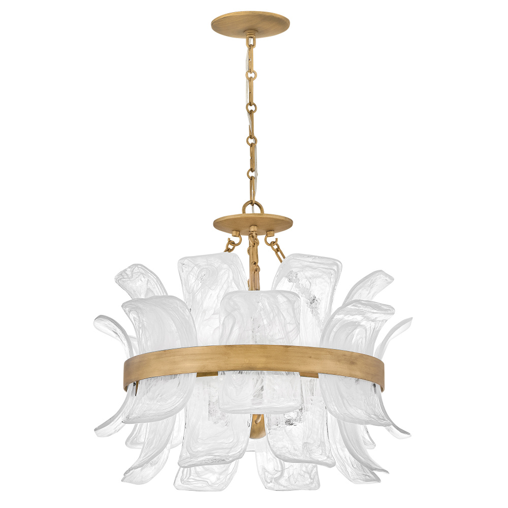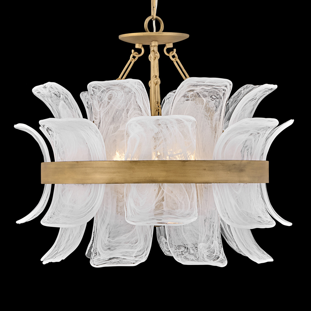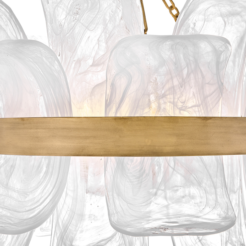 Deftly slumped and artfully arranged sheets of swirled glass appear to unfurl from Fleur’s beautiful drum silhouette, complemented by a central band hand-painted in Burnished Gold. White, cloud-like layers softly diffuse inviting illumination from warm candelabra lamps, creating an enchanting atmosphere.