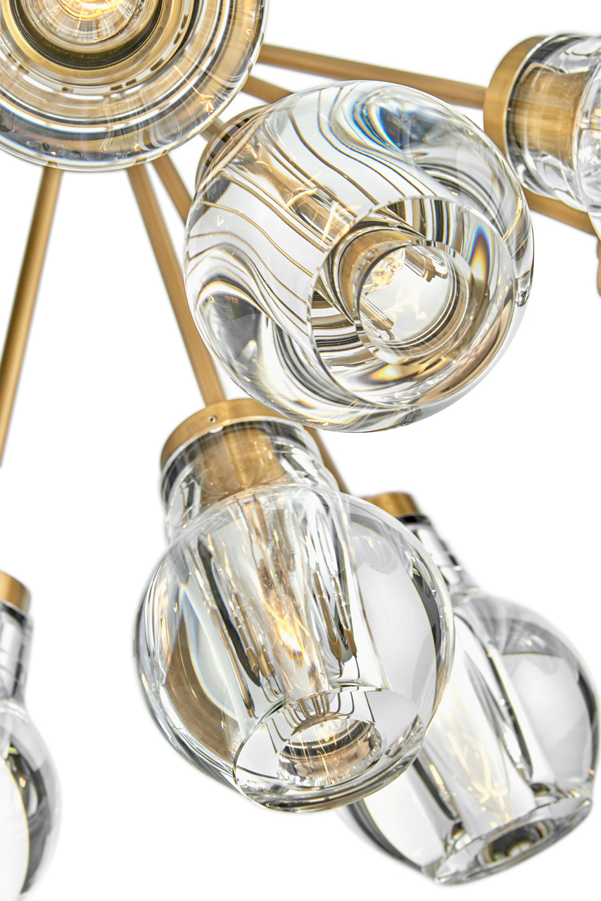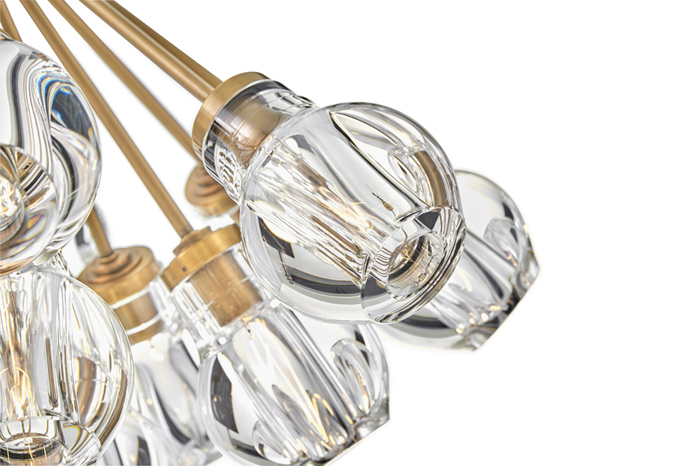 Elise infuses spaces with mesmerizing elegance. Light dramatically refracts from jaw-dropping, rounded, thick-cut crystal shades arranged in an enticing cluster formation. The robust arms, offered in either rich Black or Heritage Brass finishes, extend outward in a beautiful radiating pattern.