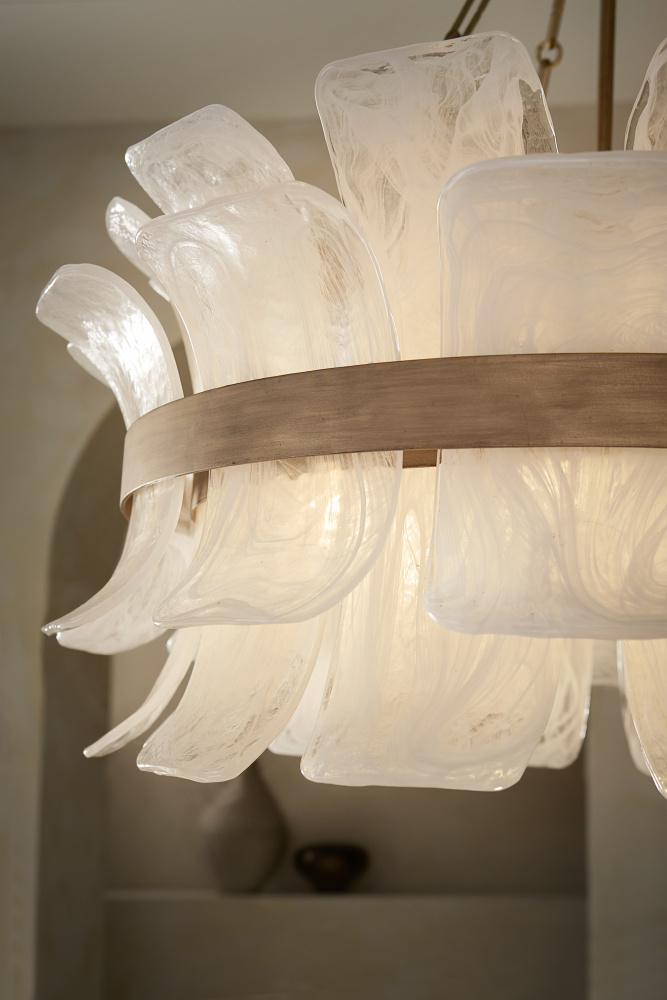 Deftly slumped and artfully arranged sheets of swirled glass appear to unfurl from Fleur’s beautiful drum silhouette, complemented by a central band hand-painted in Burnished Gold. White, cloud-like layers softly diffuse inviting illumination from warm candelabra lamps, creating an enchanting atmosphere.