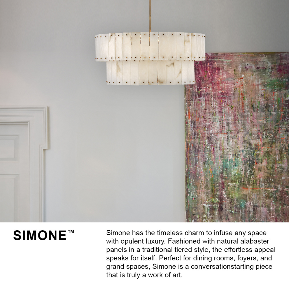 Simone has the timeless charm to infuse any space with opulent luxury. Fashioned with natural alabaster panels in a traditional tiered style, the effortless appeal speaks for itself. Perfect for dining rooms, foyers, and grand spaces, Simone is a conversation-starting piece that is truly a work of art.