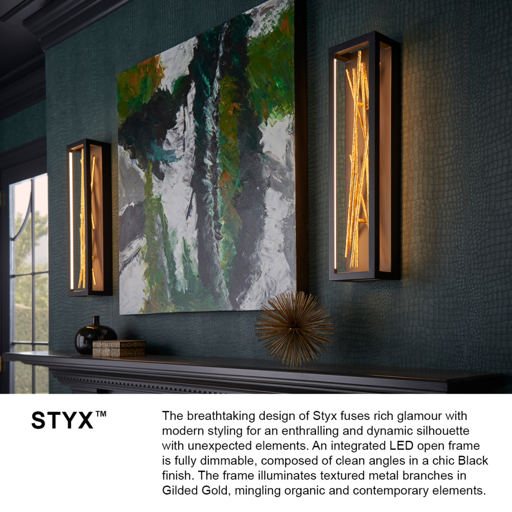 The breathtaking design of Styx fuses rich glamour with modern styling for an enthralling and dynamic silhouette with unexpected elements. An integrated LED open frame is fully dimmable, composed of clean angles in a chic Black finish. The frame illuminates textured metal branches in Gilded Gold, mingling organic and contemporary elements.