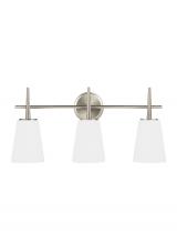 The Driscoll three light vanity fixture in satin brass provides abundant light for your bath vanity, while adding a layer of today's style to your interior design. The 1960âs-inspired Driscoll collection by features the clean lines of tapered stems and glass shades. Simplicity combined with sophistication creates this strikingly modern look. Offered in a Brushed Nickel finish in addition to the Chrome finish also offered for wall/bath fixtures all of which feature Etched White glass shades. The assortment includes nine-light, five-light and three-light chandeliers, a mini pendant, as well as one-light, two-light, three-light and four-light wall/bath fixtures. Both incandescent lamping and ENERGY STAR-qualified LED lamping are available; all fixtures are California Title 24 compliant.