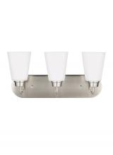 The Kerrville three light vanity fixture in brushed nickel provides abundant light for your bath vanity, while adding a layer of today's style to your interior design. With a simple, airy appearance, the Kerrville lighting collection by embraces its modern design roots while enhancing virtually any homes decor. Tubular steel arms extend outward and curve to present beautiful tapered, Satin Etched glass shades. The collection has a Brushed Nickel, Burnt Sienna or Chrome finish and offers three-, five- and nine-light chandeliers, a one-light mini pendant, one- and three-light pendants, a two-light semi-flush mount which can convert to a pendant, and one-, two-, three- and four-light bath fixtures. Incandescent and ENERGY STAR-qualified LED lamping are available; all fixtures are California Title 24 compliant.