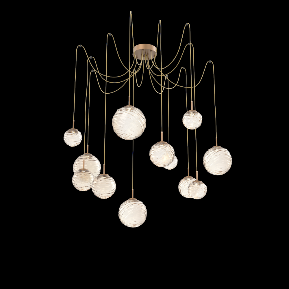 Gaia Round 12pc Swag Multi - Pendant - Novel Brass - Amber Blown Glass - Cloth Braided Cord - LED - 2700K