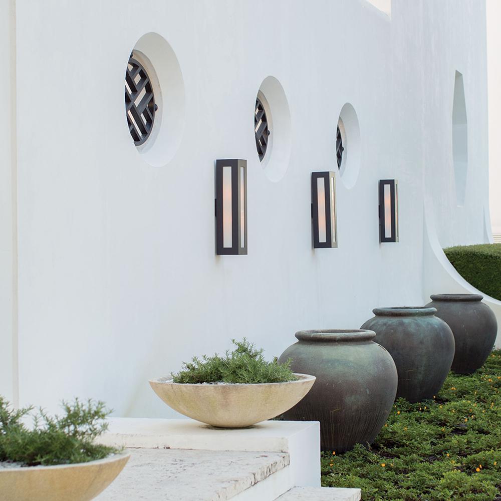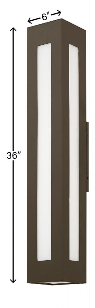 Dorian’s robust design in durable aluminum construction is offered in a Bronze finish. This contemporary fixture allows light to emit from white glass windows.