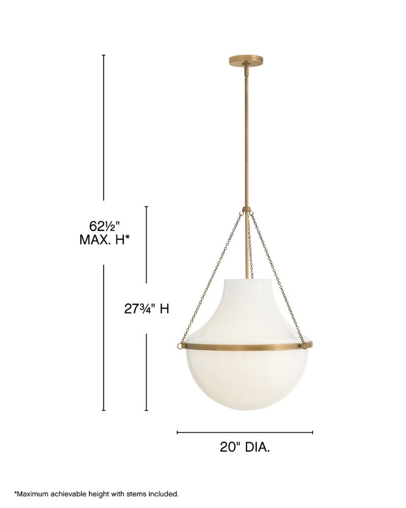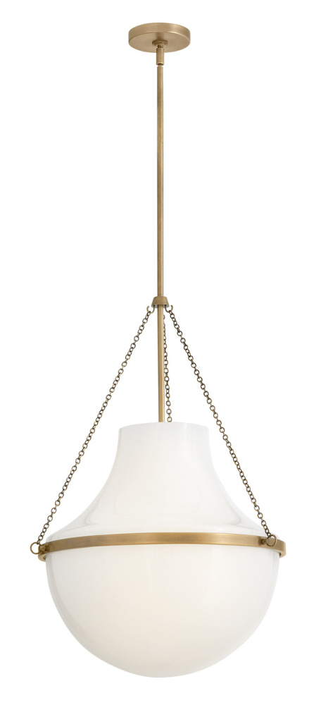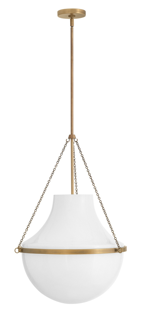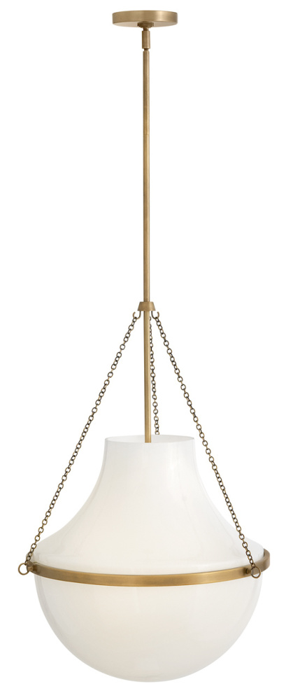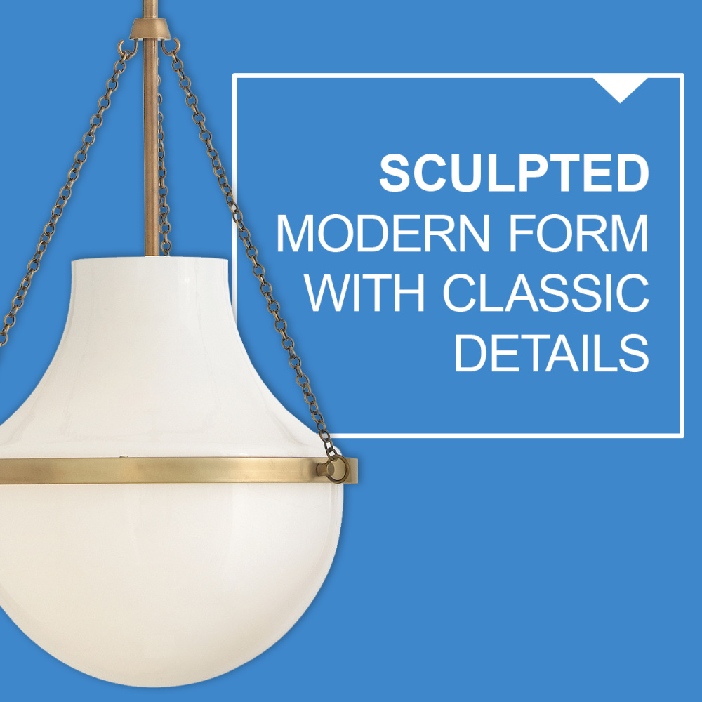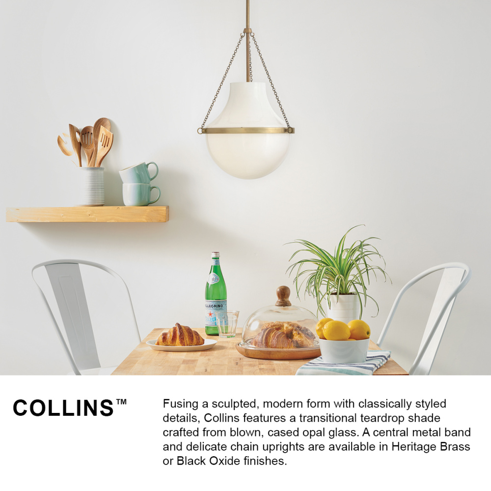 Fusing a sculpted, modern form with classically styled details, Collins features a transitional teardrop shade crafted from blown, cased opal glass. A central metal band and delicate chain uprights are available in Heritage Brass or Black Oxide finishes.