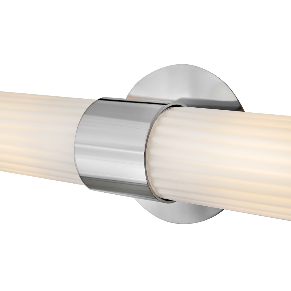 Blending transitional modern style with plenty of functional illumination, Nina is crafted to add a timeless accent to your bath or living space. Rounded Cased Opal glass shades with ribbed detailing glow beautifully, casting warm, even light throughout the surrounding room. A metal backplate and flared arm are finished in Black, Chrome, or Lacquered Brass to complement any decor effortlessly.