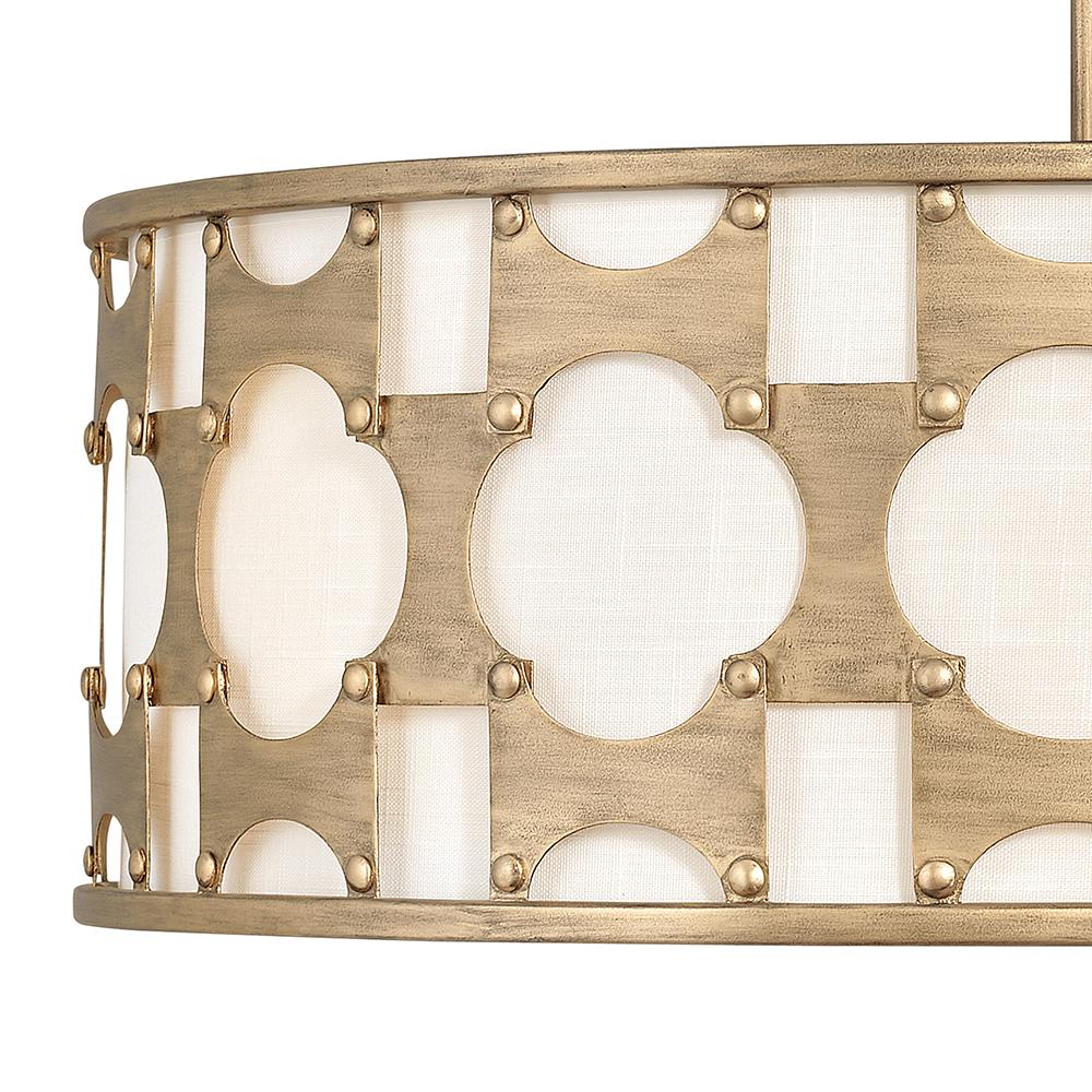 Carter is a traditional drum silhouette with details galore. An intricate, hand-riveted pattern in Burnished Gold encompasses the off-white textured fabric shade. A decorative candle cluster bursts within to further enhance this dynamic design.