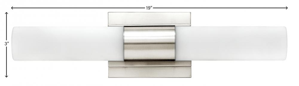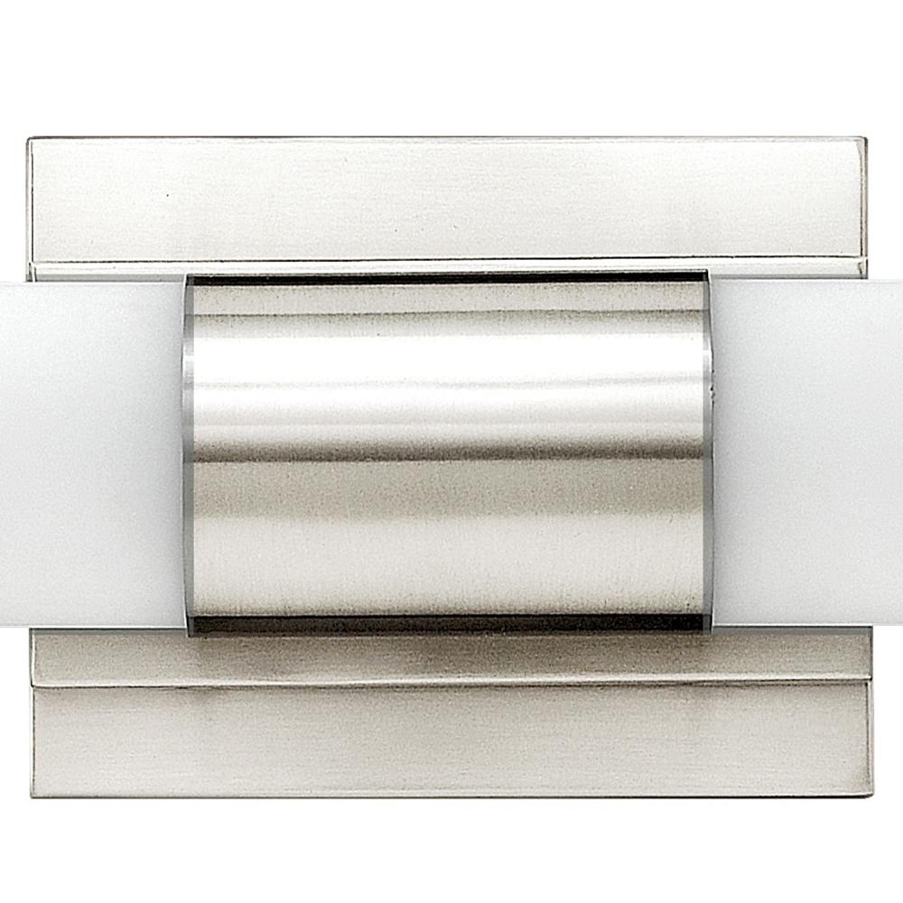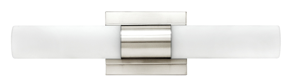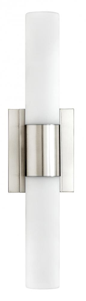 Portia's slim profile unifies design and technology. A pair of blown etched opal glass cylinders extends from a center metal fixture body, creating a streamlined cylindrical form. Finished in either Brushed Nickel or Polished Nickel, this eco-efficient linear LED collection is fully dimmable and provides even, warm white light. The raceway back plate and optional junction box cover plate provide multiple mounting opportunities.