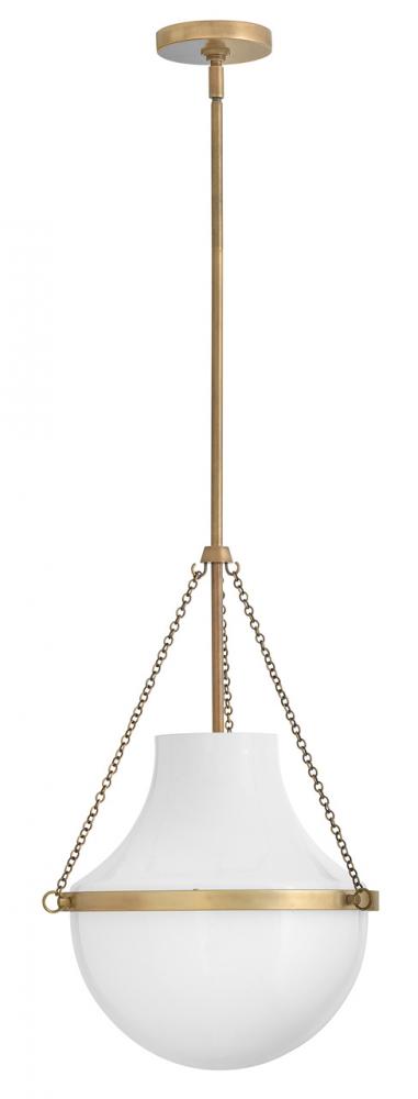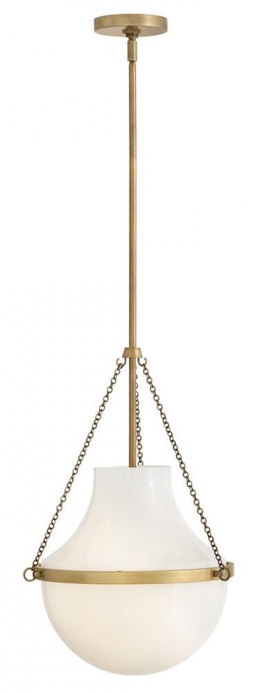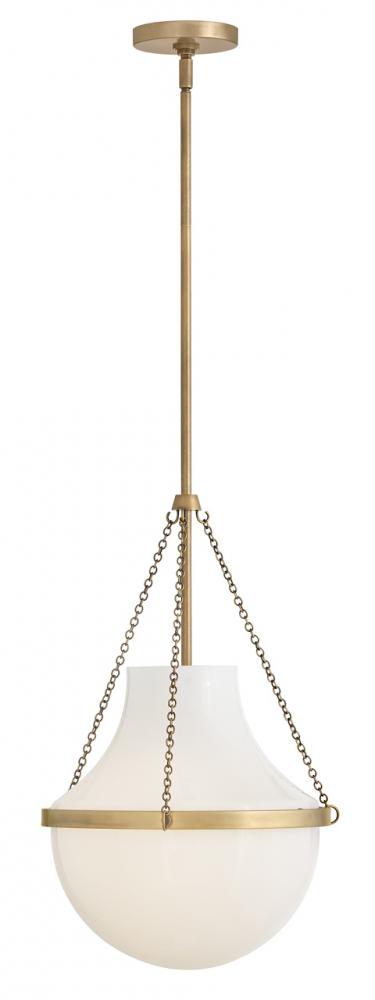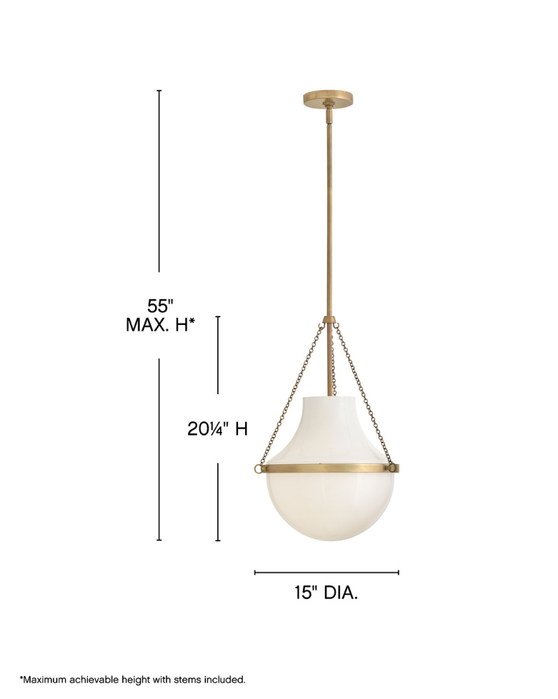 Fusing a sculpted, modern form with classically styled details, Collins features a transitional teardrop shade crafted from blown, cased opal glass. A central metal band and delicate chain uprights are available in Heritage Brass or Black Oxide finishes.