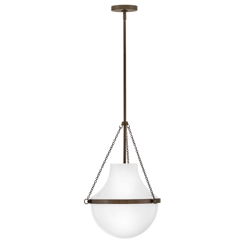 Fusing a sculpted, modern form with classically styled details, Collins features a transitional teardrop shade crafted from blown, Cased Opal glass. A central metal band and delicate chain uprights are available in Black Oxide, Heritage Brass, Heritage Bronze, or Polished Nickel finishes.