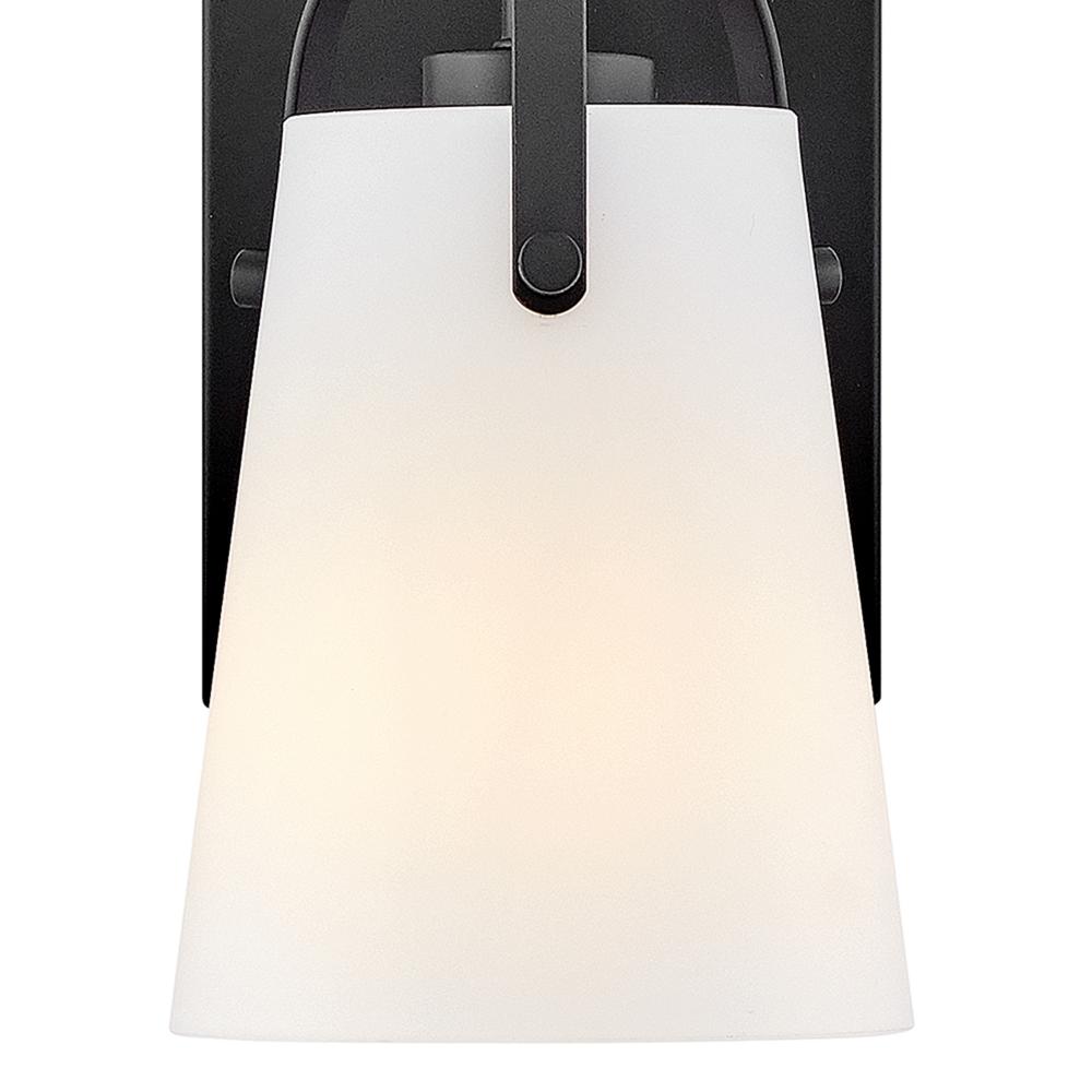 Clean and airy, Foster breathes composed simplicity into any bath space. Its softly tapered glass shade, suspended from arched handle prongs, creates a sophisticated transitional silhouette, enhanced by practical yet stylized details.
