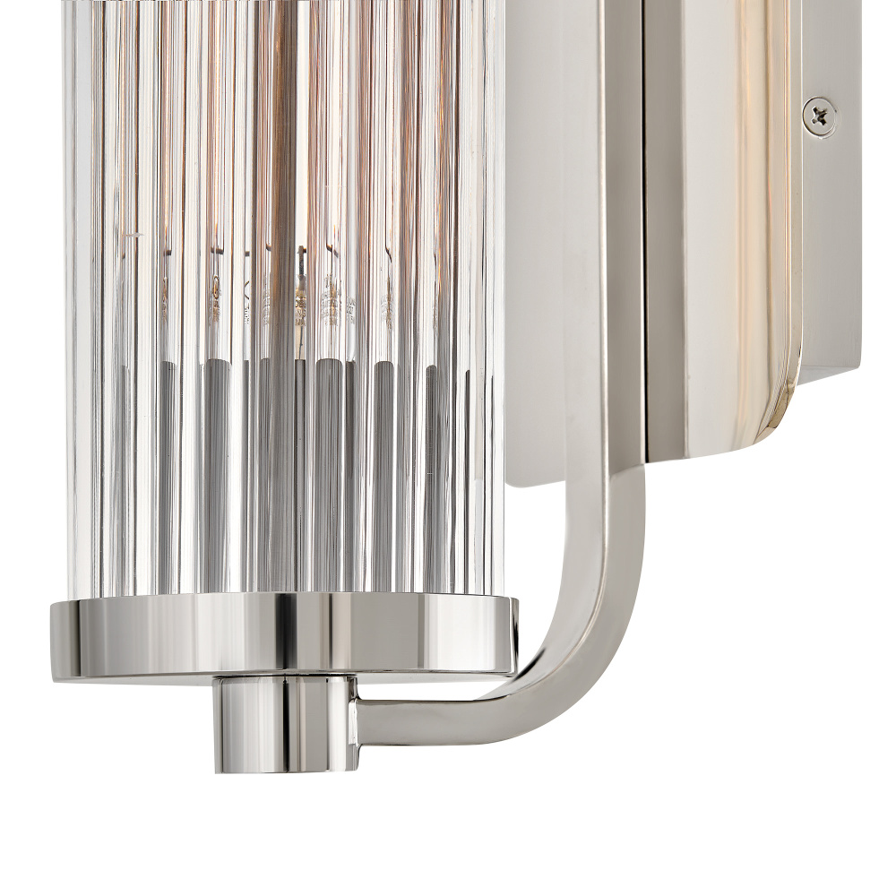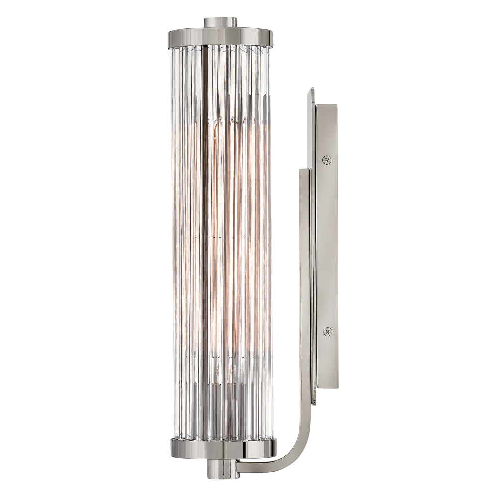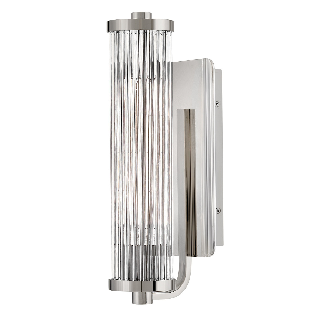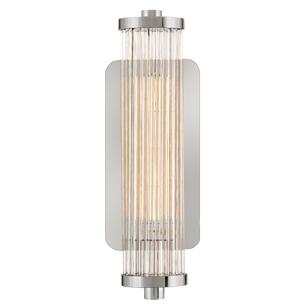A touch of modern style and vintage charm, Ellery’s Clear glass shade is composed of tall cylindrical glass rods, creating a beautiful reeded effect when illuminated. A large rectangular backplate and matching end caps are finished in a Black Oxide, Heritage Brass, or Polished Nickel finish that complements any bath or living space.